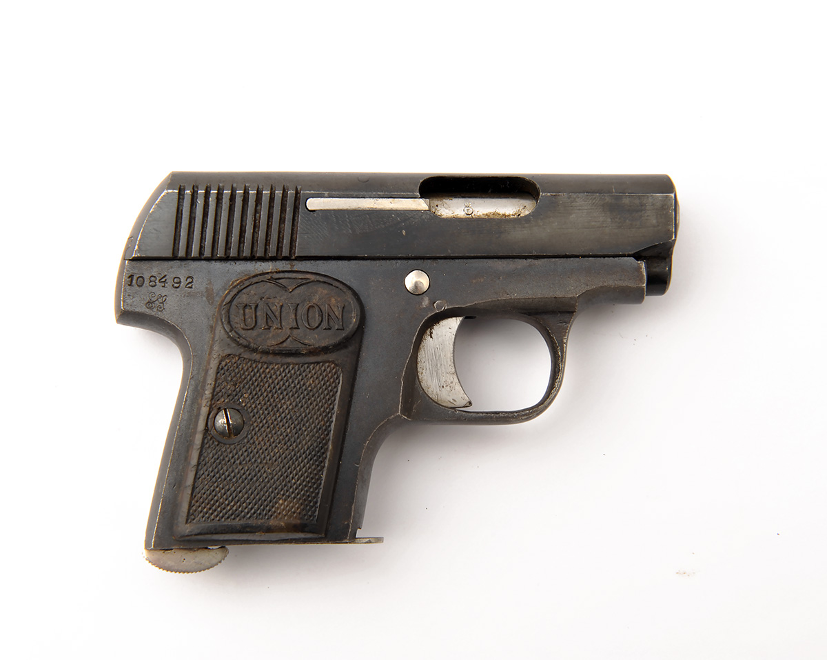 A .25 (ACP) SEMI-AUTOMATIC POCKET-PISTOL SIGNED UNION, serial no. 108492, with 2in. barrel, blued slide and frame and chequered hard rubber grips,