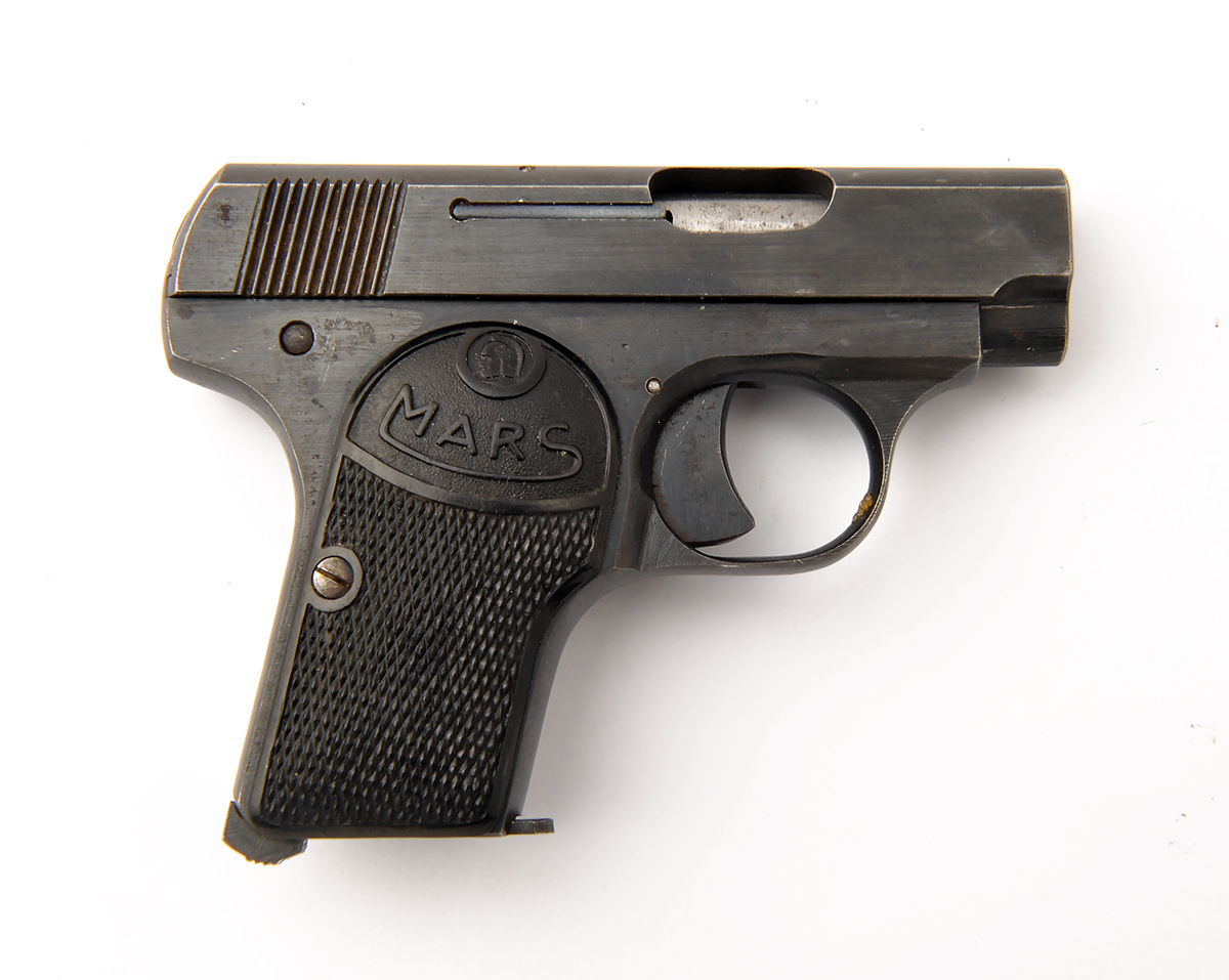 A .25 (ACP) SEMI-AUTOMATIC POCKET-PISTOL SIGNED MARS, serial no. 5656, with 2in. barrel, blued slide and frame and chequered black plastic grips (one repaired)