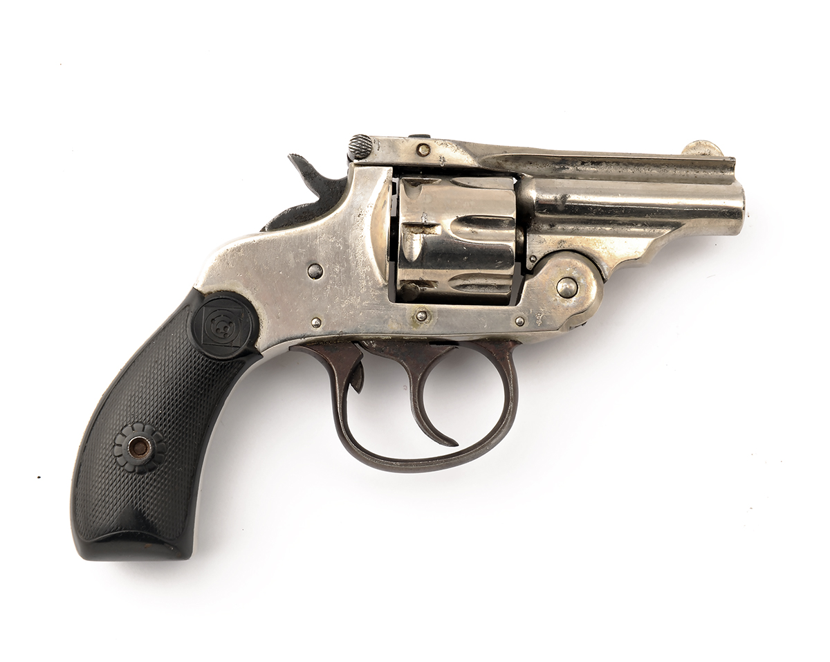 A .22 (L/R) POCKET-REVOLVER SIGNED HARRINGTON & RICHARDSON, serial no. 443139, with 2in. barrel, break-open frame, fluted cylinder and chequered black plastic grips, retaining most of its original nickel-plated finish