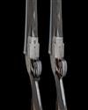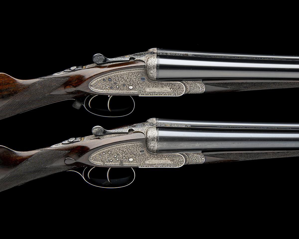 28in. nitro barrels (replacements by the makers, No.1 proof dated 1981, No.2 proof dated 1995), the ribs engraved 'WILLIAM EVANS. 63. PALL MALL. ST. JAMES'S. LONDON.' and gold-inlaid '1' and '2' at the breech ends, 2 1/2in. chambers, bored approx. imp. cyl. and 1/4 choke (both), treble-grip actions, removable striker discs, toplevers gold-inlaid '1' and '2', border and flowing acanthus scroll engraving, pins reblued, 14 3/4in. figured stocks with fully scroll-engraved steel heel and toe plates, weight 6lb. 9oz. (No.1) 6lb. 5oz. (No.2), in their makers brass-cornered oak and leather case