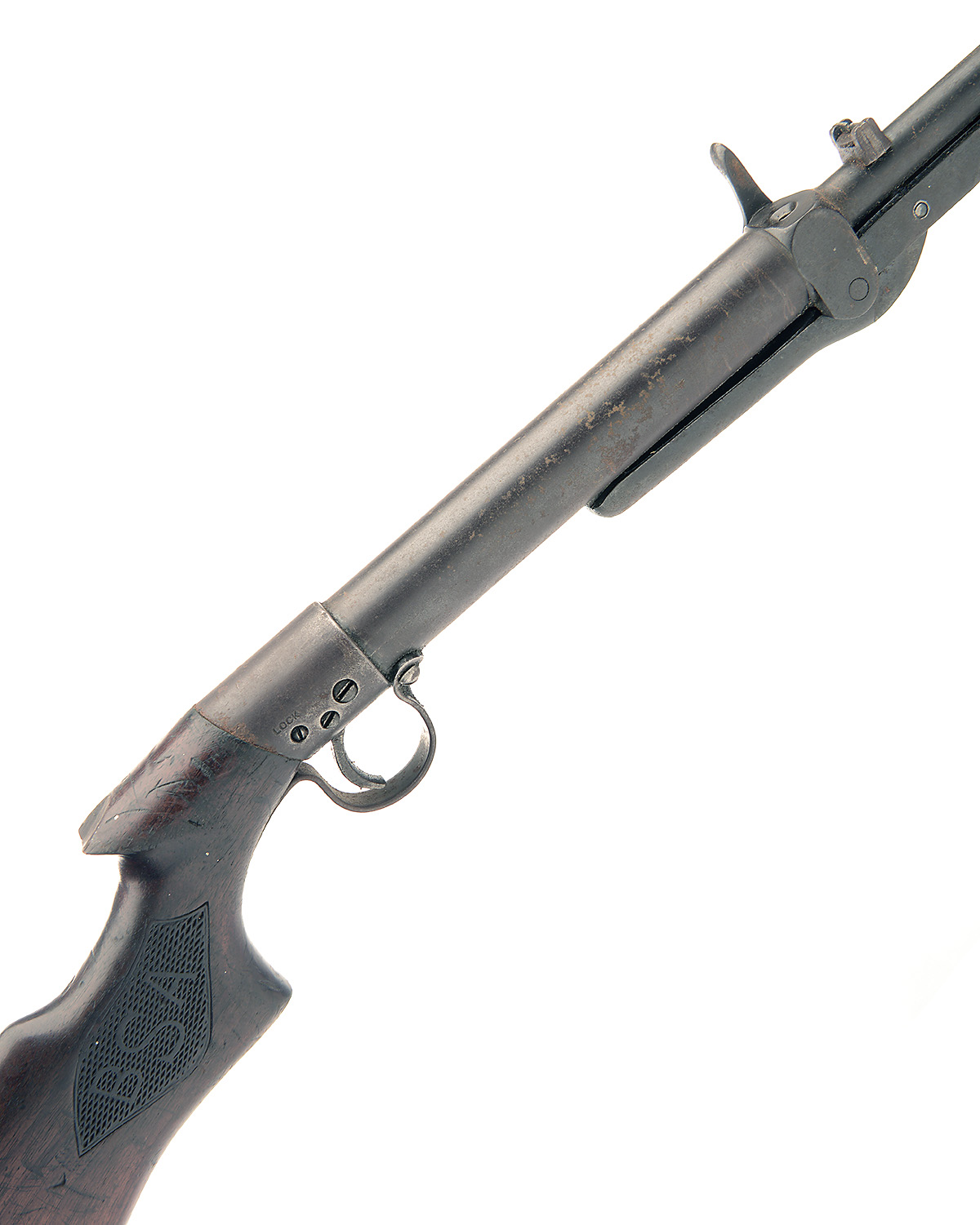 A .177 UNDER-LEVER AIR-RIFLE SIGNED BSA, MODEL 'THE BSA AIR-RIFLE LIGHT PATTERN', serial no. L35642, for 1929, with 17in. barrel (missing fore-sight), plain air-chamber, saw-handled walnut butt (missing stock bolt cover) and push-button under-lever, corroded externally, small losses