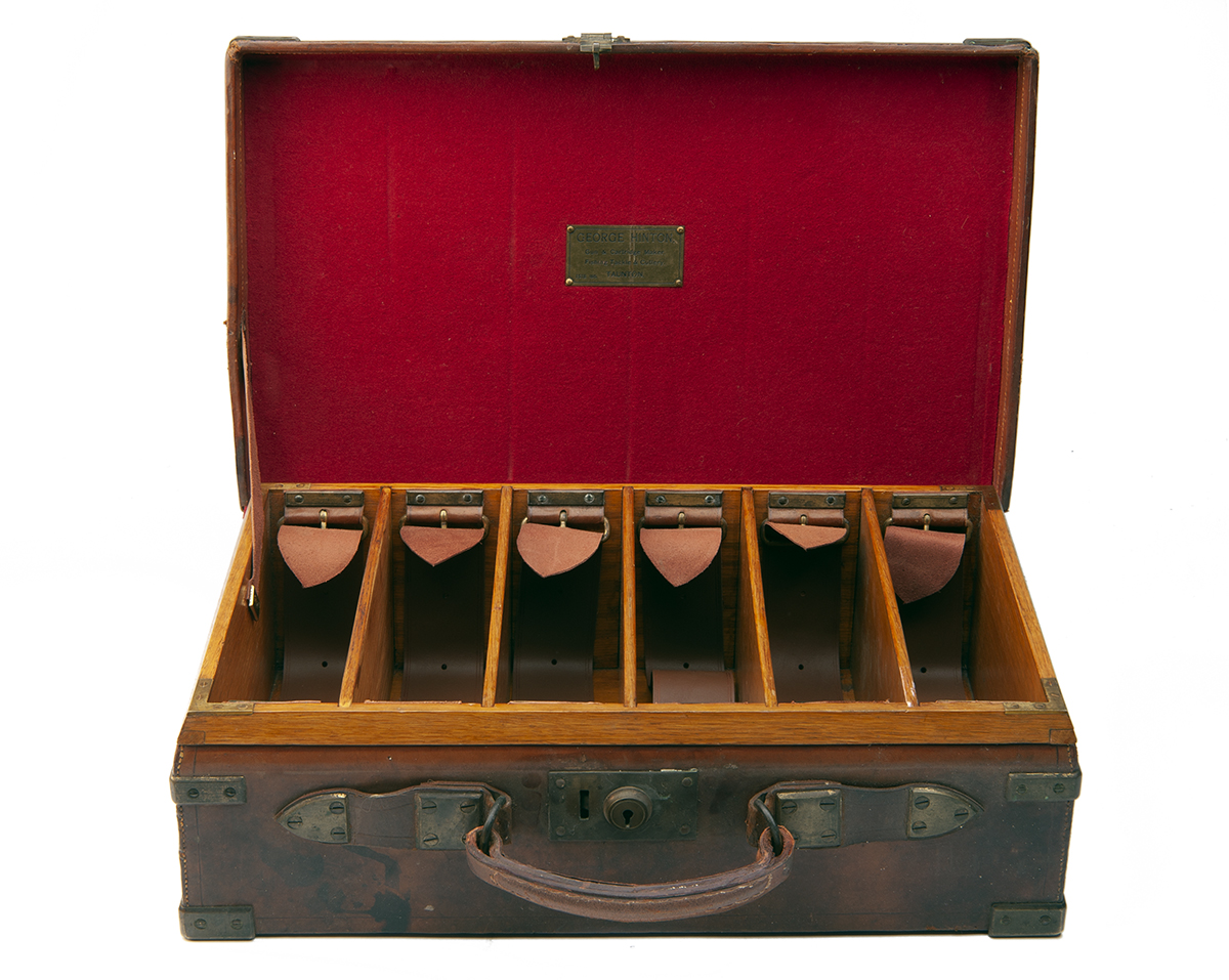 GEORGE HINTON A BRASS-BOUND OAK AND LEATHER CARTRIDGE MAGAZINE,