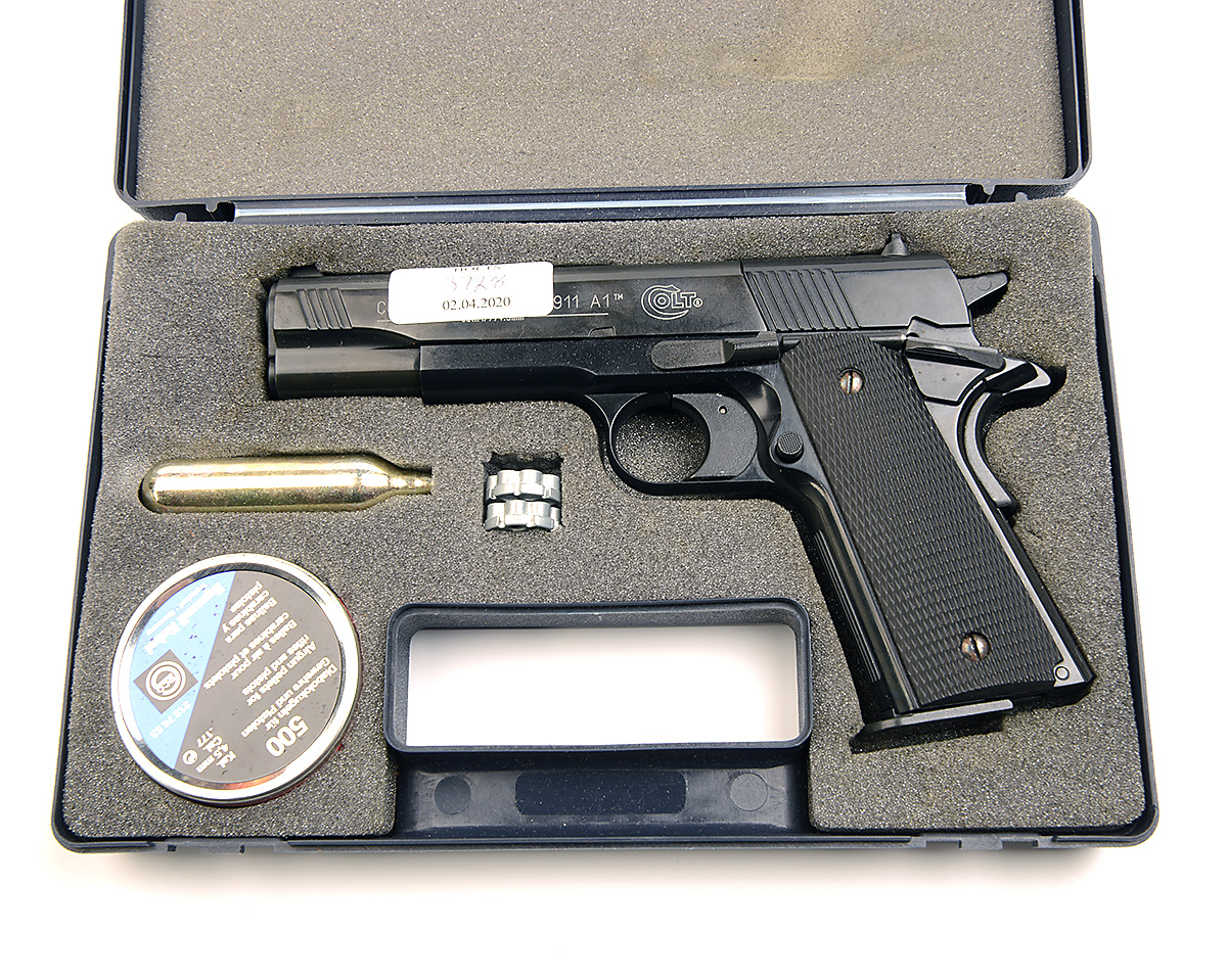 A CASED .177 CO2-POWERED AIR-PISTOL SIGNED COLT, MODEL '1911AI', serial no. F7281191, with blued 5in. barrel, blued receiver, chequered soft rubber grips and complete in its maker's plastic carry case with gas, pellets and two magazines, untested