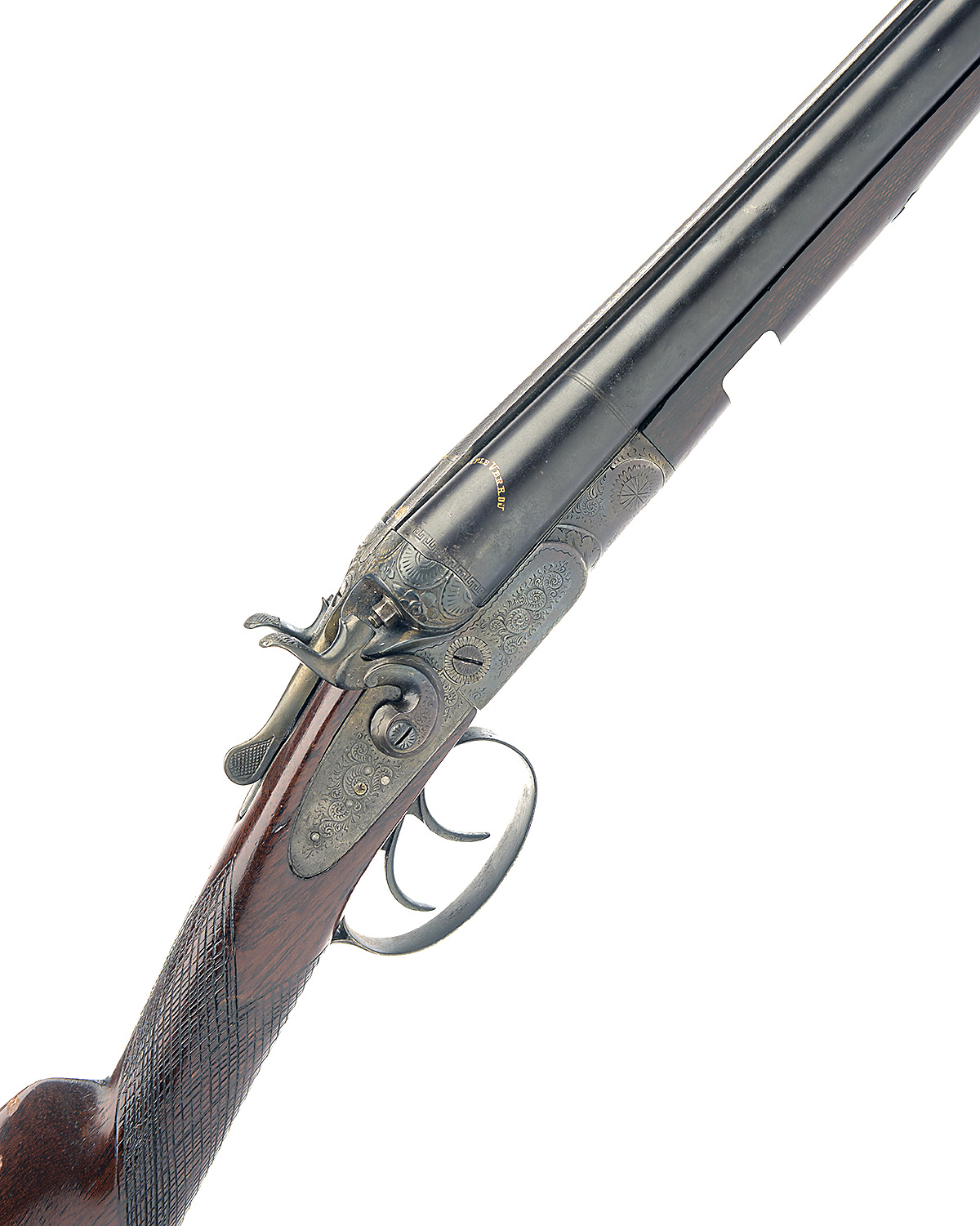 A FRENCH 12-BORE TOPLEVER HAMMERGUN, serial no. 13946, 27 1/2in. nitro barrels with matt rib, gold-inlaid 'ACIER COCKERILL.', the tubes gold inlaid 'TRIPLE VERRDU', and marked 'EPREUVE OFFICIELLE POUR POUDRE SANS FUMEE.', 2 1/2in. chambers, bored approx. 1/2 and 3/4 choke, treble-grip action, carved fences, rebounding locks with C-scroll hammers, border and acanthus scroll engraving, retaining slight traces of colour-hardening and finish, 14 1/2in. replacement stock including steel buttplate