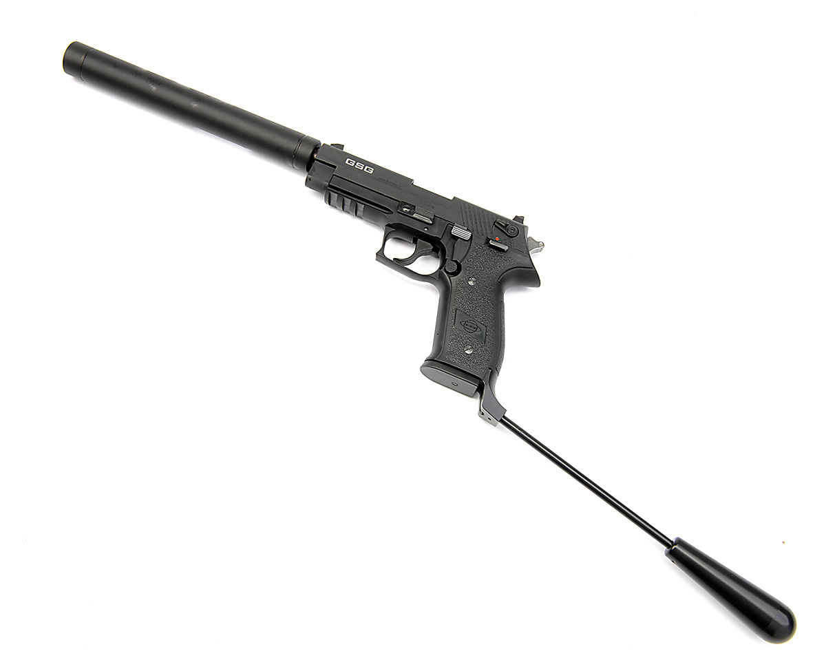 A CASED .22 (L/R) SEMI-AUTOMATIC LONG-BARRELLED PISTOL SIGNED GSG, MODEL 'FIREFLY', serial no. F407648, with 11 7/8in. barrel including dummy sound-moderator, black finished slide and frame, permanently attached extension bar to rear for UK law and black plastic grips, appearing little used, in its maker's abs case