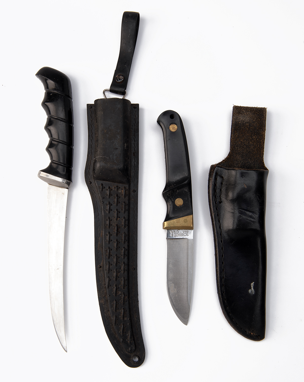 TWO FIXED-BLADE SPORTING-KNIVES, ONE SIGNED 'SCHRADE', and with drop-point 3 1/8in. blade, full tang with brass bolsters and moulded handle, complete with a leather scabbard, the second a 6in. filleting knife with moulded plastic handle, alloy fittings and plastic scabbard
