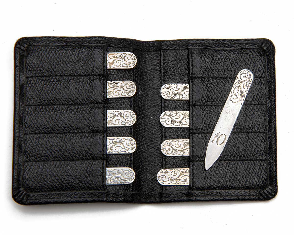 number one to ten, with foliate scroll engraving, H&H 925 silver hall marks, housed in a leather wallet