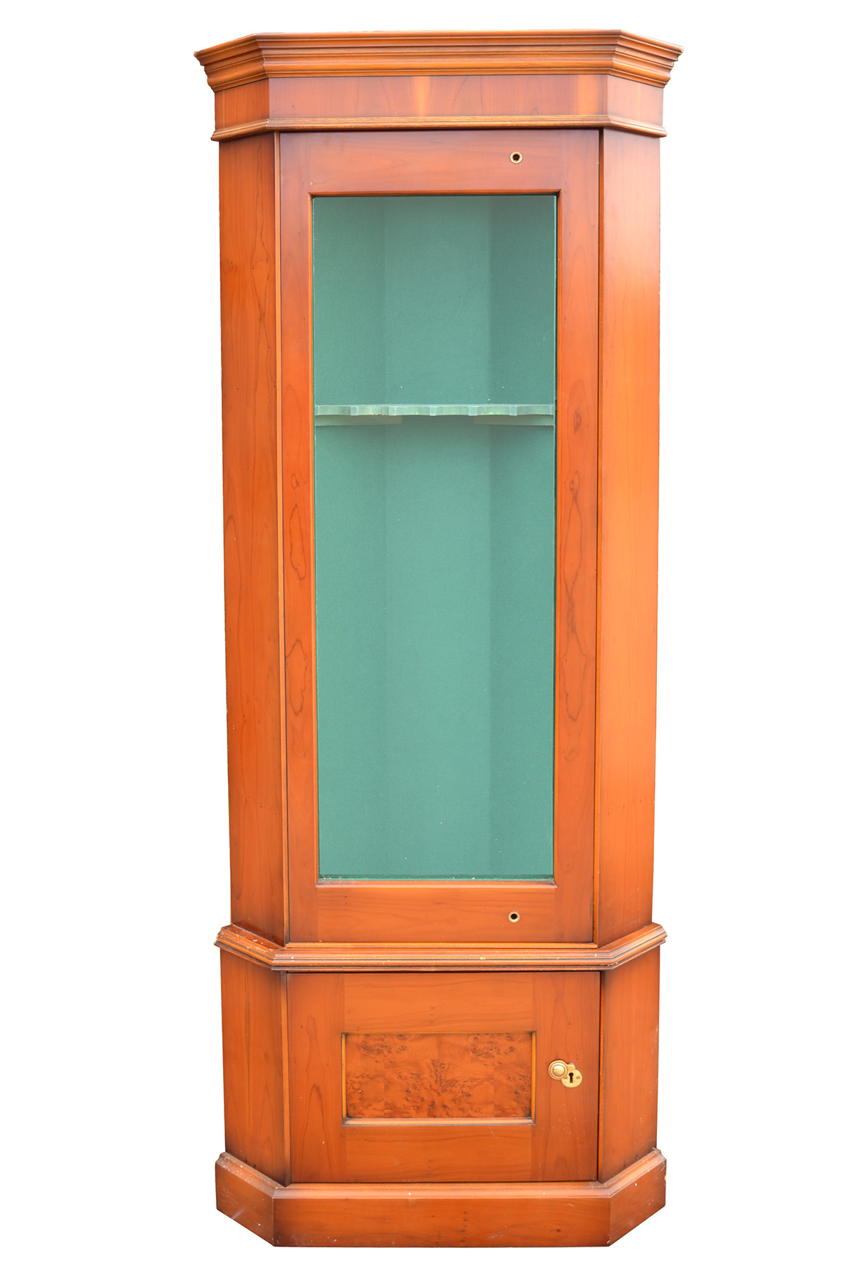 fitted for six guns, the interior lined with green baize with interior light, solid 3mm steel with a walnut finish, two bramah type MD17 high security solid safe locks, 18mm thick anti bandit glass of laminated polycarbonate, the underside fitted with a separate ammunition cabinet, measuring approx. 76in. x 20 3/4in.