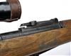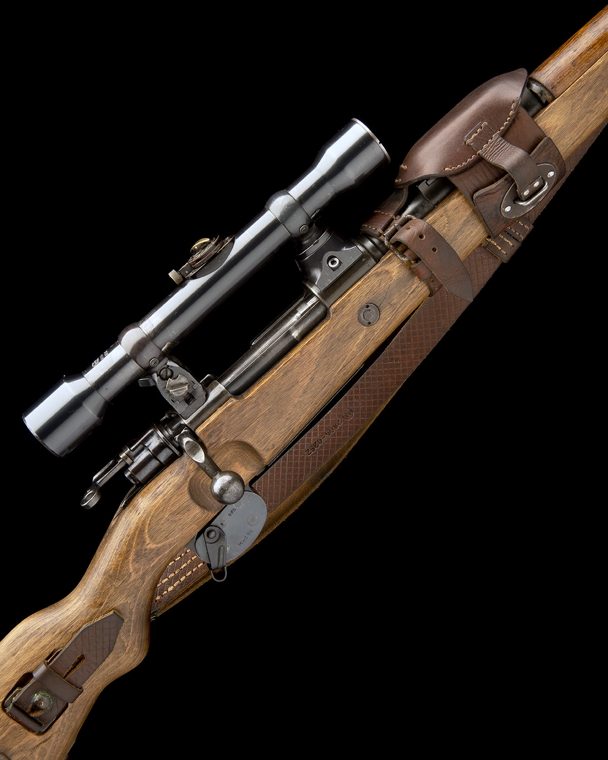 24in. nitro barrel, protected ramp-mounted foresight, tangent rear-sight graduated to 2000 meters with reproduction leather cover, fitted with a period Carl Zeiss Zielvier telescopic sight with reproduction mounts, reproduction lens covers, action with cut-out and marked 'Mod.98', extended flag safety, reproduction winter trigger, detachable floorplate, steel butt-plate with leather side sling, non matching serial numbers