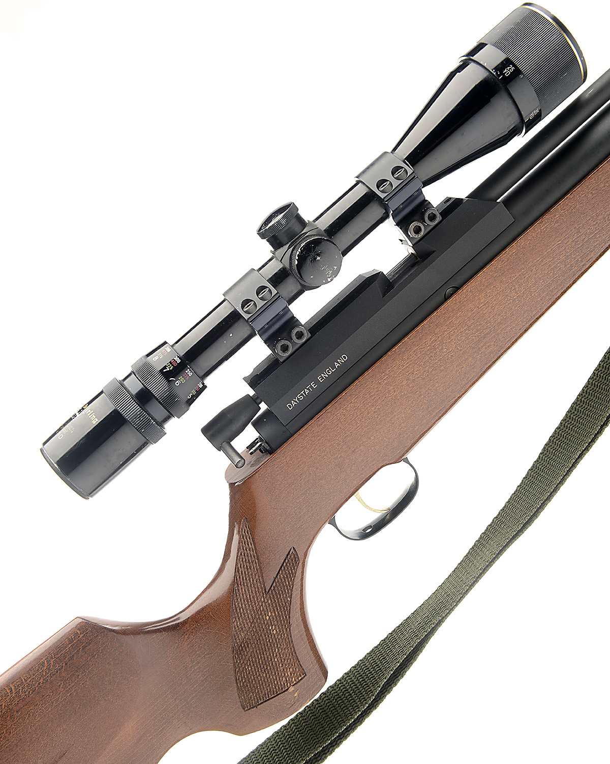 A .22 PRE-CHARGED PNEUMATIC AIR-RIFLE SIGNED DAYSTATE, MODEL 'HARRIER', serial no. HR1264, with 20in. blacked barrel including built-on sound-moderator, bolt action single shot receiver, under-barrel air reservoir and ambidextrous beech three-quarter stock, untested, fitted with a Nikko Sterling 4-12x40 telescopic sight