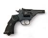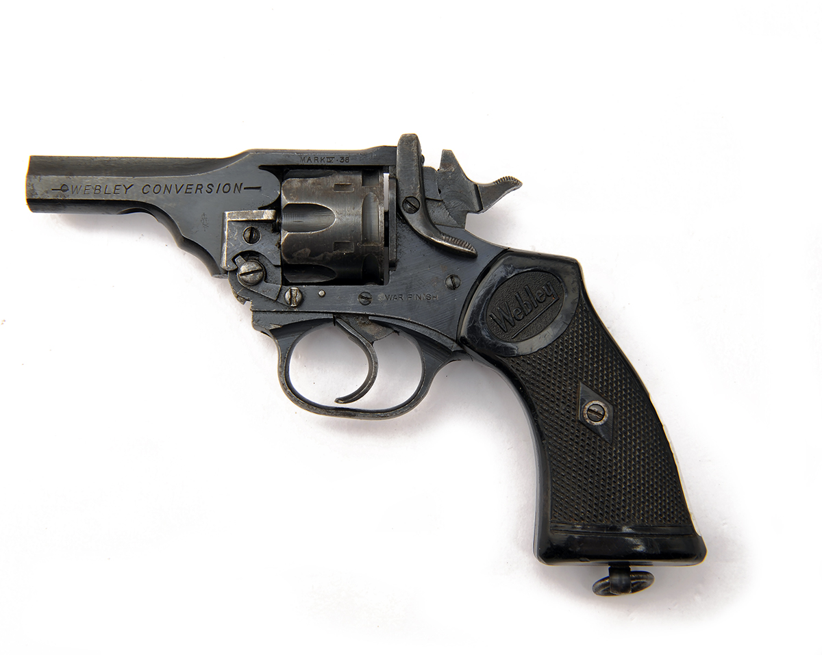 A .38 (S&W BLANK) SIX-SHOT CONVERTED REVOLVER SIGNED WEBLEY & SCOTT, MODEL 'MKIV', serial no. 108793, converted by shortening the barrel to 3in. blocking and venting forwards and below, with a webbing Pattern '37 holster