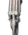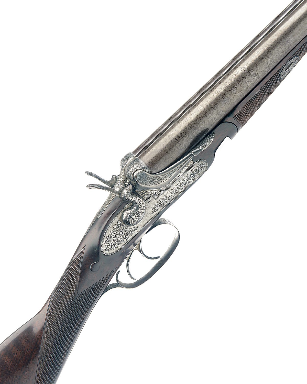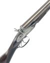 JOSEPH NEEDHAM 12-BORE 1862 PATENT SIDELEVER SINGLE-BOLT SNAP-ACTION SELF HALF-COCKING BAR-IN-WOOD HAMMERGUN, serial no. 1303, 30in. black powder only damascus barrels, rib engraved 'JOSEPH NEEDHAM. PATENTEE. 26. PICCADILLY. LONDON.', 2 1/2in. chambers, bored approx. true cyl. in both, right bore dimension marginal, some internal pitting to barrels and chambers, action incorporating Needham patent rotating single bolt sidelever patent, patent no. 1544 of 1862, use number 436, the fences with external cams half-cocking the hammers as the sidelever is pushed down, slim fences and side bolsters, non-rebounding sidelocks with high-spurred hare's-ear hammers (one spur slightly bent), permanently attached fore-end, missing grip safety, best border and fine acanthus scroll engraving, brushed finish overall, 14 1/2in. stock including steel buttplate, weight 7lb. 3oz.