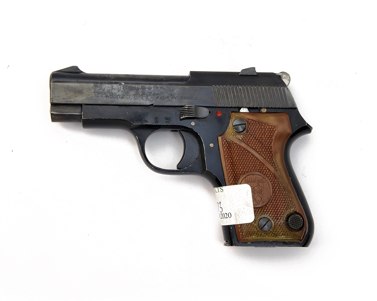 A .22 (L/R) SEMI-AUTOMATIC PISTOL SIGNED UNIQUE, MODEL 'L', serial no. 564457, with exposed 3in. barrel, open blued slide, blacked alloy frame and chequered golden-brown plastic grips