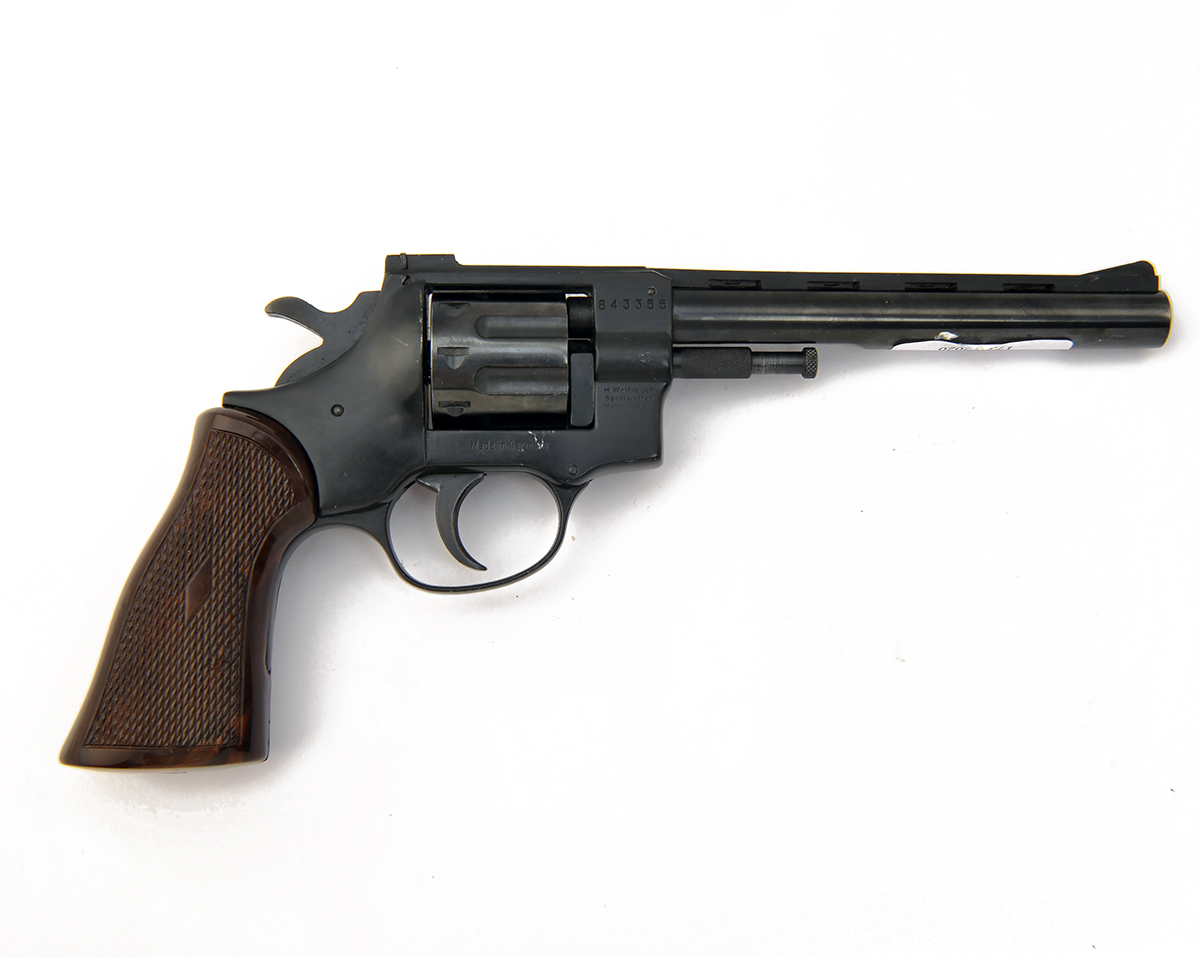 A .22 (L/R) EIGHT-SHOT REVOLVER SIGNED ARMINIUS, MODEL 'HW7S', serial no. 843355, with blued 6in. barrel, raised ventilated rib, blued swing-out fluted cylinder, blacked alloy frame and chequered bakelite grips