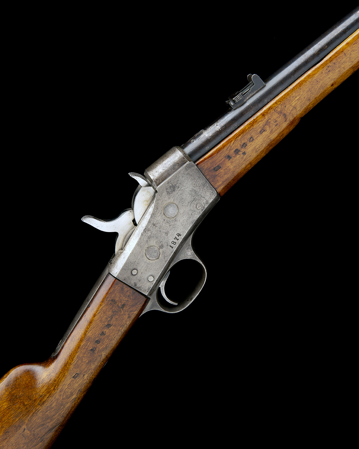 dated for 1874, with blued round 18in. barrel, applied fore-sight blade, small elevating ladder rear-sight, colour hardened rolling block action of Remington type, pale hardwood butt-stock with vacant identity disk set into the left hand side, brass heel-plate, splinter hard-wood fore-end with single barrel-band and replacement iron clearing rod