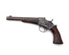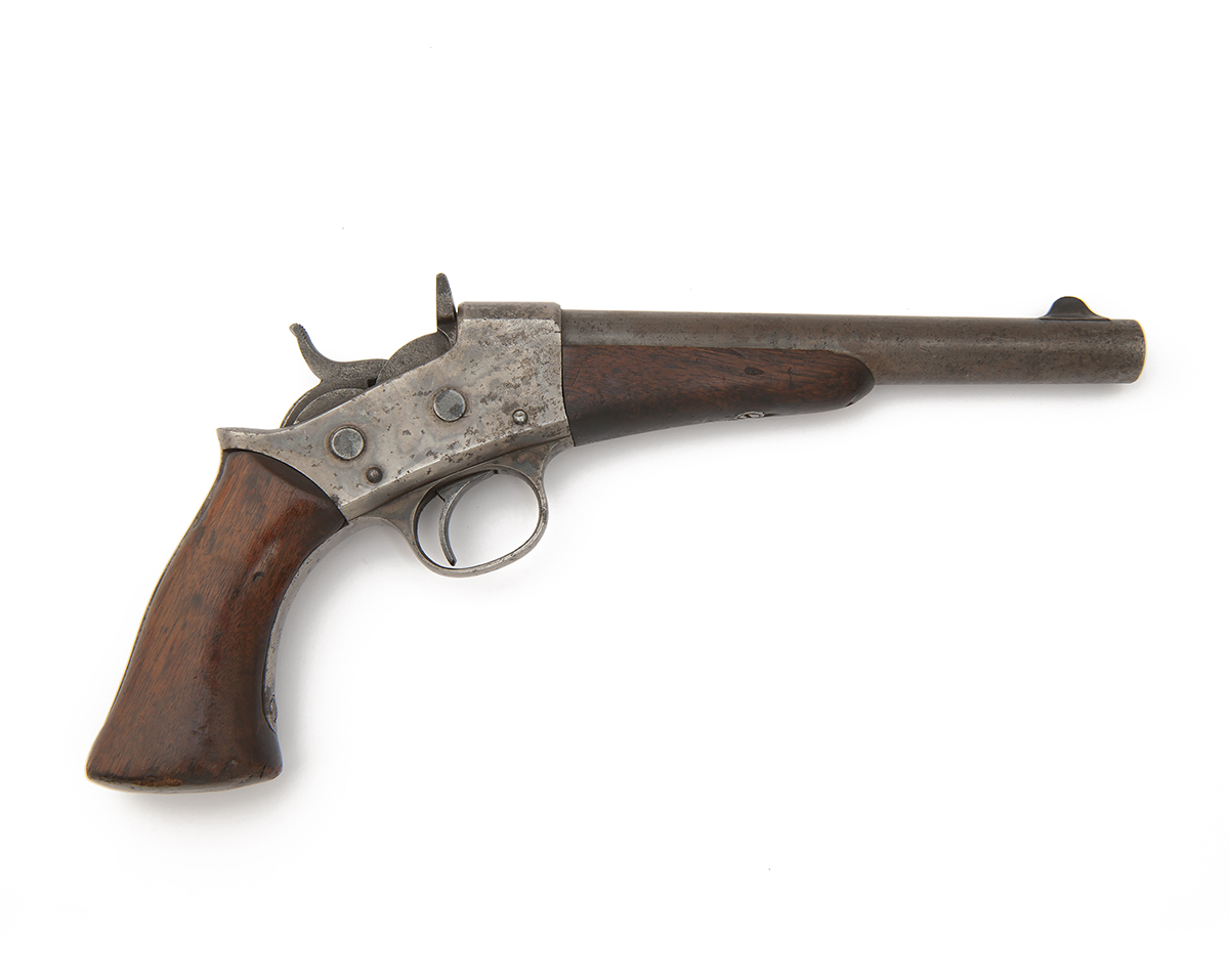 for between 1872-88, with round slightly tapering 8in. barrel, pinched blade fore-sight, sighting notch to the top of the rolling breech, colour hardened frame marked on the left 'REMINGTONS ILION N.Y. U.S.A.' over patent dates to 1866, 'P' and 'S' inspector's initials, guarded trigger, exposed hammer, smooth flared walnut grip with traces of a martial cartouche at heel (some cracks and inlet repairs at base) and walnut splinter fore-end (small losses at tip)