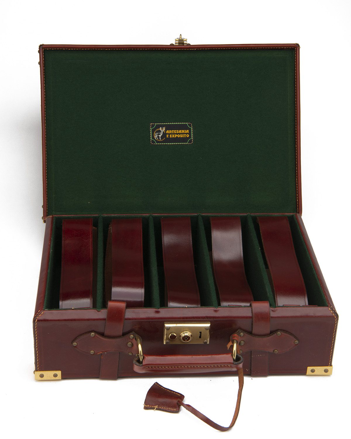 for approx. 300 cartridges, the interior lined with green baize, four fixed dividers, five leather lifters, brass lock (including key)