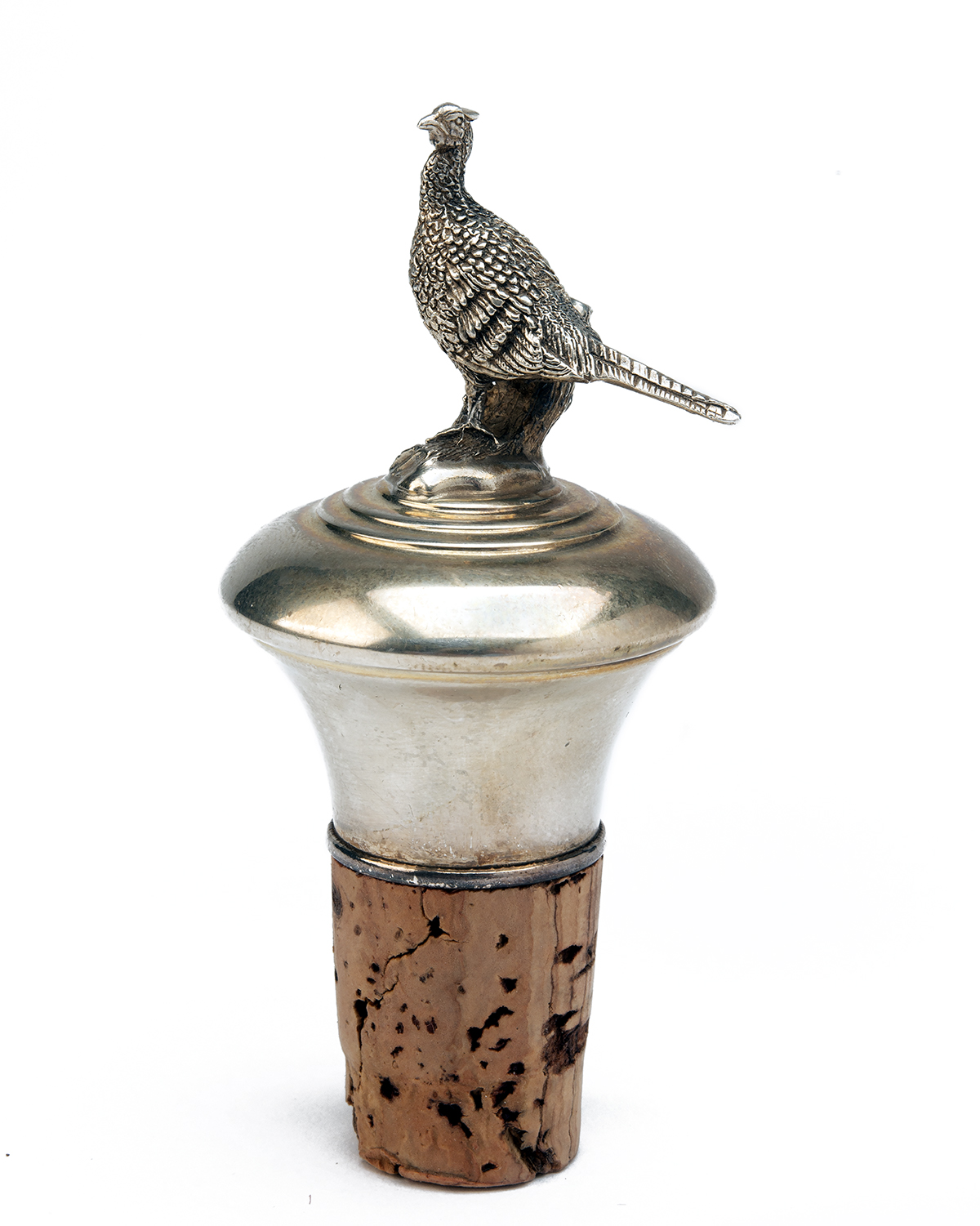 A STERLING SILVER PHEASANT TOP CORK BOTTLE STOPPER,
