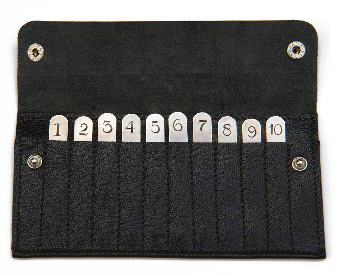 with ten pegs numbered 1-10, LWS 925 silver hallmarks dated 2007, set in a leather wallet