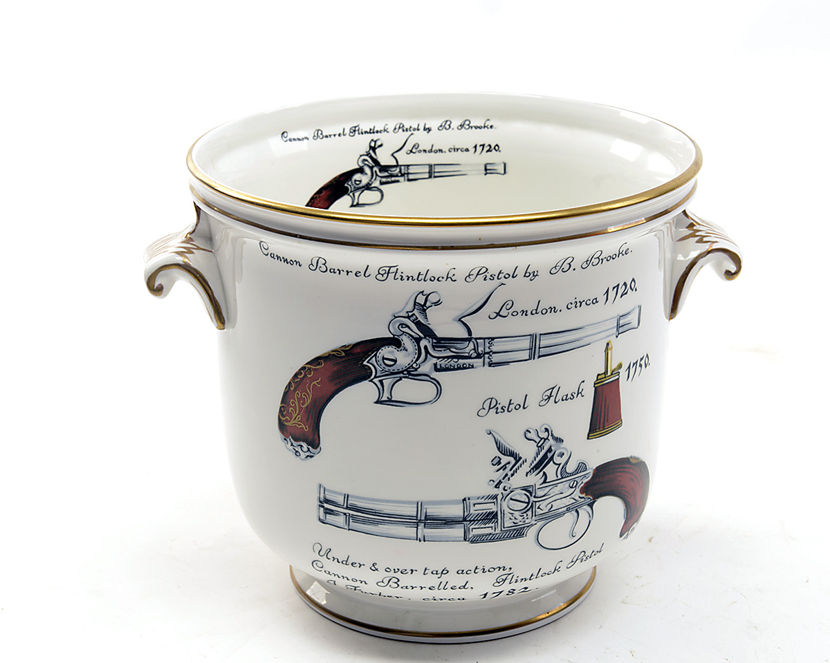 A CHINA PRESENTATION BOWL, 'Made for The Presentation Company English Fine Bone China', white bowl with scenes for flintlock pistols and powder flasks