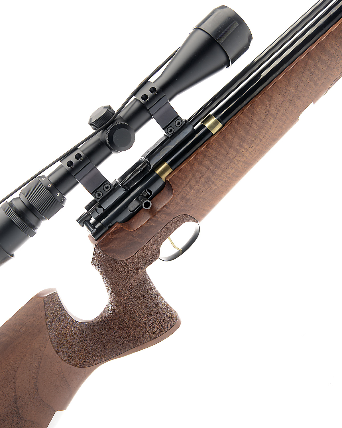 A .22 PRE-CHARGED PNEUMATIC AIR-RIFLE SIGNED TITAN, MODEL 'MANITOU TARGET MT010T', serial no. 02984, with 25 3/4in. barrel including brass detailed sound moderator, blued bolt-action receiver, brass detailed air-reservoir and figured stippled walnut three-quarter stock with high comb, fitted with an Original 3-9x40 telescopic sight, collector's condition