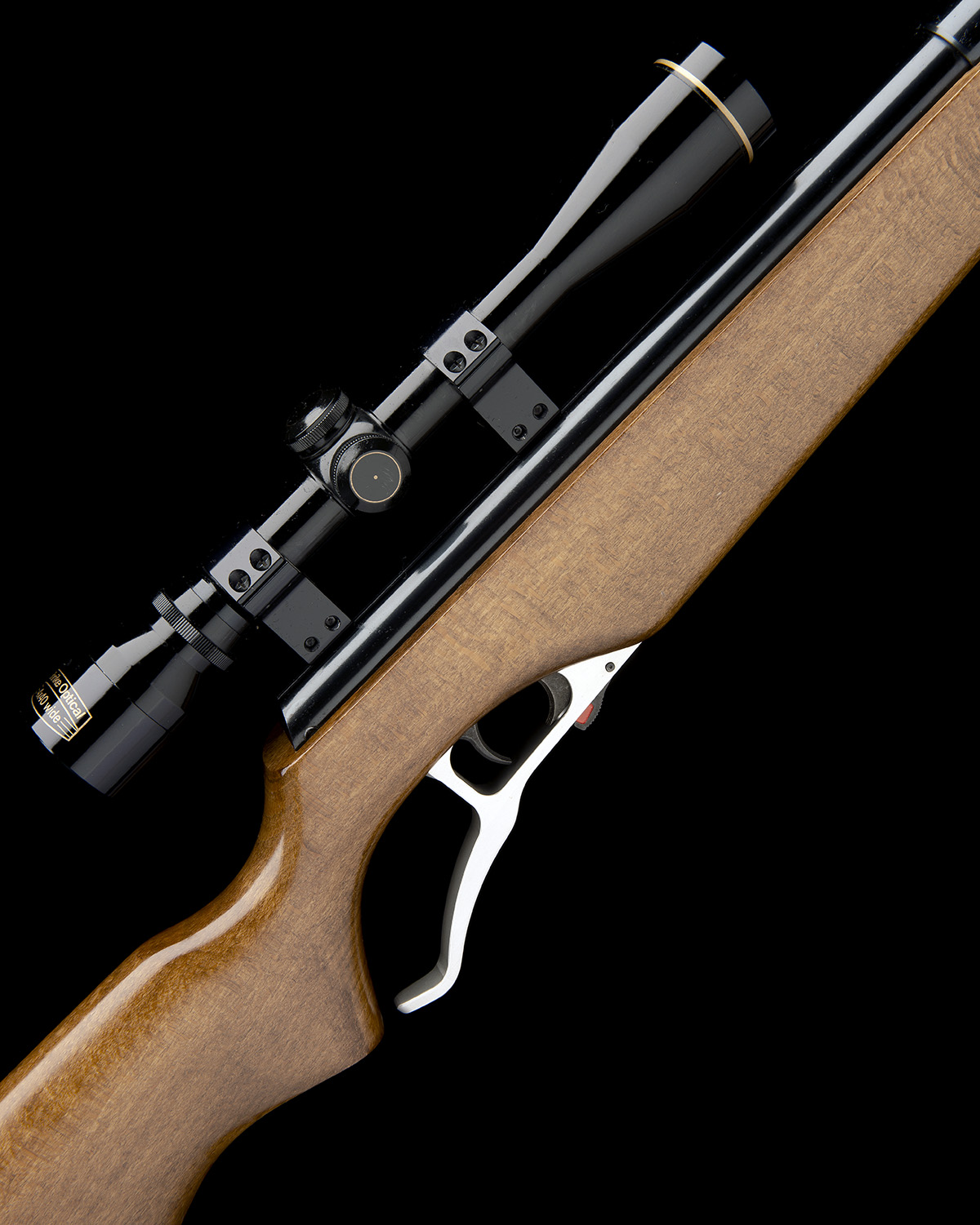 made to Rutten's patent circa 1995, with exposed, fixed 19 3/4in. blued barrel including built-on sound moderator, lift-up breech-block stamped with the company's 'RA' monogram, blued air-chamber railed for a telescopic sight, the side of air-chamber marked 'WINSTAR MACH 1 DE MADE BY RUTTEN AIRGUNS HERSTAL BELGIUM PATENTED ALL OVER THE WORLD', ambidextrous beech half-stock, alloy under-lever concealed in the fore-end and also forming the trigger-guard, much finish remaining throughout and appearing little used and fitted with a Shrike Optical 4x40 telescopic sight