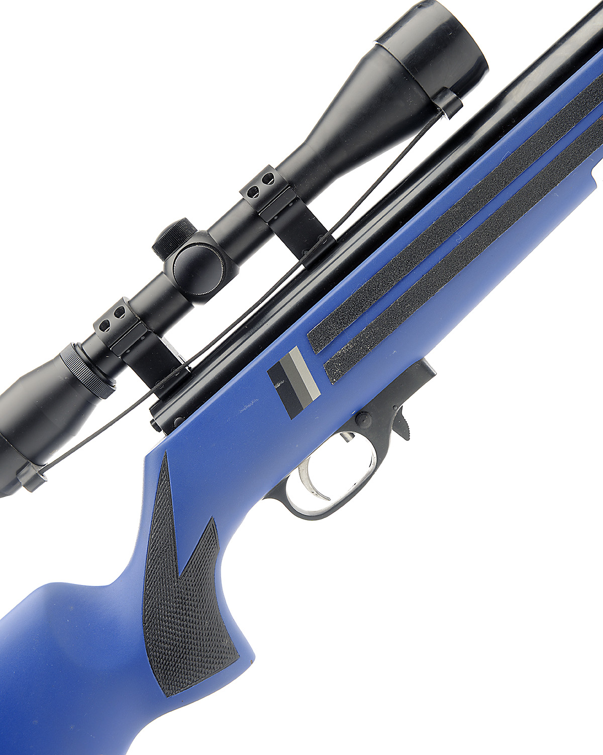 A .22 BREAK-BARREL GAS-RAM AIR-RIFLE SIGNED WEIHRAUCH, MODEL 'HW90 BLUE', serial no. 31249631, with blued 19 1/2in. barrel including sound moderator, blued air chamber, special limited edition blue plastic coated beech half-stock, collector's condition, complete with a Nikko Sterling 4x40 telescopic sight