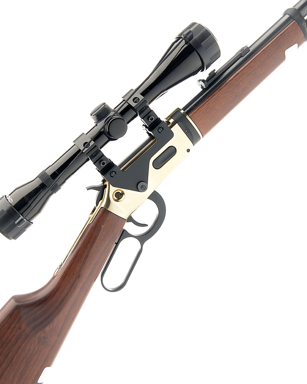 A .177 CO2-POWERED LEVER ACTION AIR-RIFLE SIGNED WALTHER, MODEL 'WELLS FARGO', serial no. W111133241, with blued and sighted 20in. barrel, gilt finished receiver in imitation of a Winchester 1894 rifle (magazine absent) and printed with a stage-coach scene, walnut butt-stock and fore-end and dummy under-barrel magazine, appearing little used but untested, together with a Tasco 4x32 telescopic sight