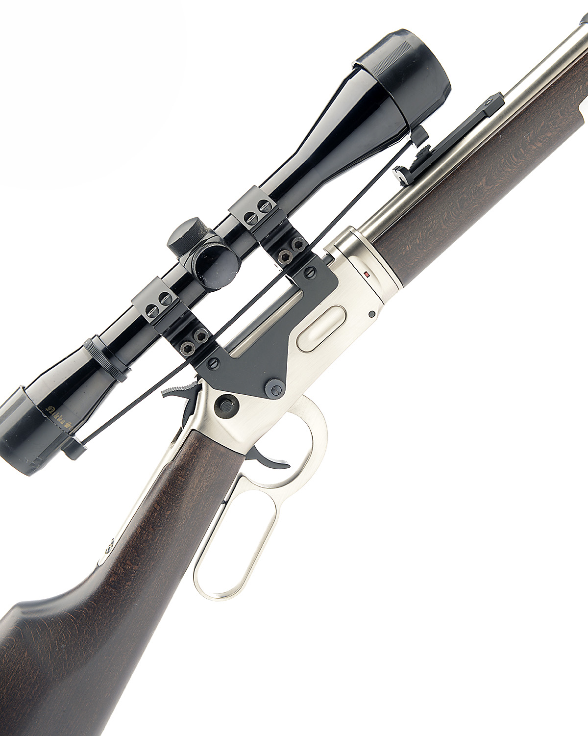 A .177 CO2-POWERED LEVER ACTION AIR-RIFLE SIGNED WALTHER, MODEL 'LONG 'STAINLESS'', serial no. W123937482, with satin stainless effect sighted 19in. barrel, satin stainless effect receiver in imitation of a Winchester 1894 rifle (magazine absent), walnut butt-stock and fore-end and dummy under-barrel magazine, appearing little used but untested, together with a Nikko Sterling 4x40 telescopic sight