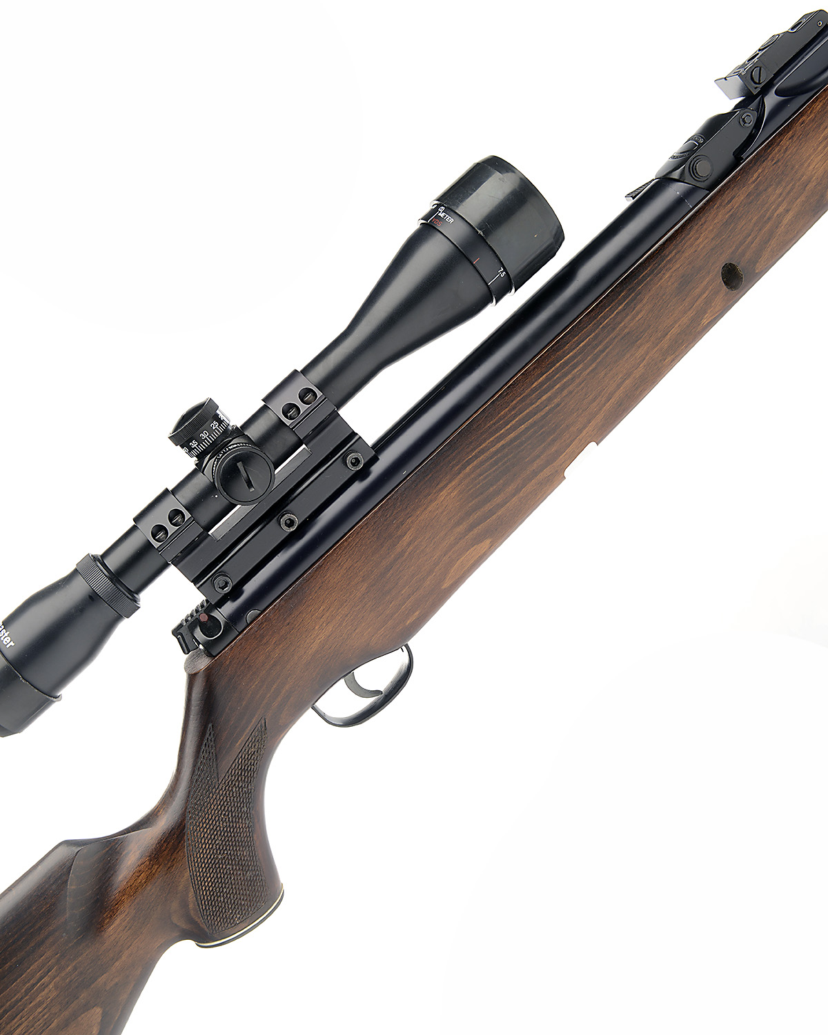 A .177 UNDER-LEVER AIR-RIFLE SIGNED WEBLEY & SCOTT, MODEL 'ECLIPSE' - serial no. 000817, with 22 1/2in. sighted barrel including sound moderator, plain air-chamber with rear-mounted safe, figured beech stock and full-length under-lever, collector's condition and fitted with a Bushmaster 4x40 telescopic sight