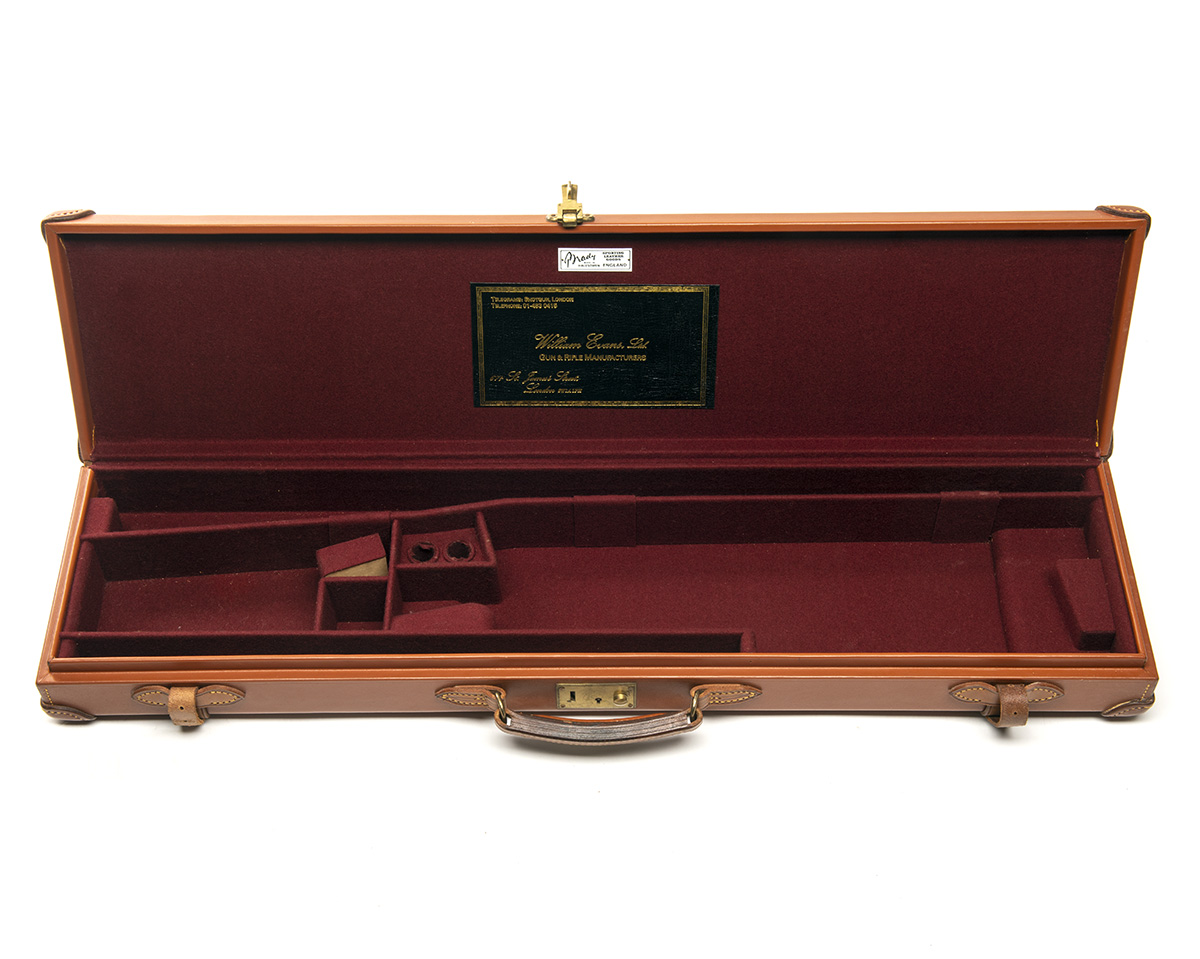 fitted for 30in. barrels, the interior lined with maroon baize, a leather gold-tooled William Evans Ltd. trade label, brass lock (key missing)