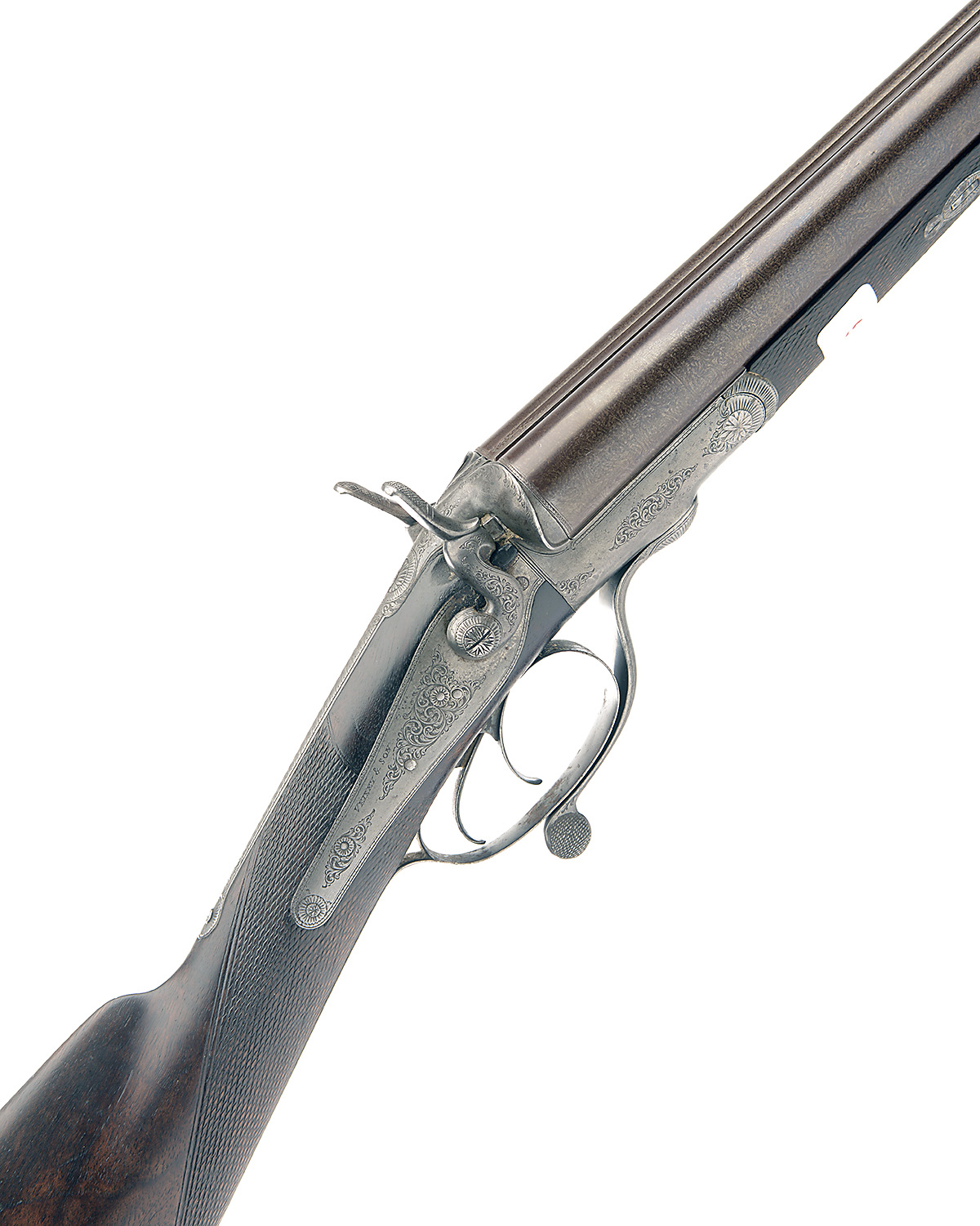 VEISEY & CO. 12-BORE ROTARY-UNDERLEVER HAMMERGUN, n.v.s.n., 29 3/4in. black powder reproved damascus barrels (pitted), rib engraved 'AGNEW & SON. 68. SOUTH STREET. EXETER.', 2 1/2in. chambers, bored approx. true cyl. in both, Jones patent rotary underlever, slender carved serpentine fences, rebounding back-action locks, beaded border and partial scroll engraving, 14 1/4in. stock including steel buttplate, weight 7lb. 2oz., in an Agnew & Sons leather case