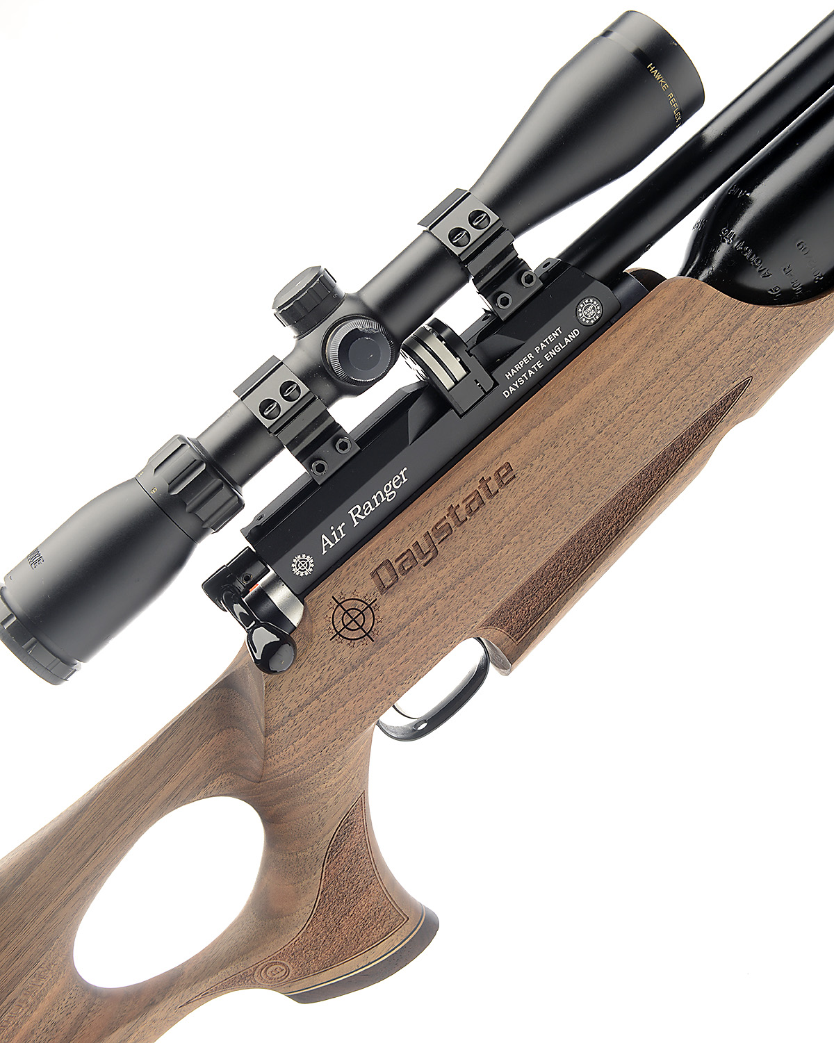 A .22 PRE-CHARGED PNEUMATIC AIR-RIFLE SIGNED DAYSTATE, MODEL 'AIR RANGER', serial no. SB5668, Slip + Adapter in slip pocket recent, with blacked 22in. moderated barrel, detachable magazine, bolt action receiver, visual pressure guage, custom walnut thumbhole stock and under-barrel reservoir, fitted with a Hawke 3-9x40 telescopic sight and complete with a soft gun-bag and filling adaptor