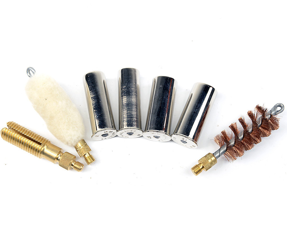 A SMALL COLLECTION OF UNUSED GUNCASE ACCESSORIES, comprising of A 12-bore & 16-bore set of nickel-plated snap-caps (both signed W.W. Greener), mop, jag, brush,