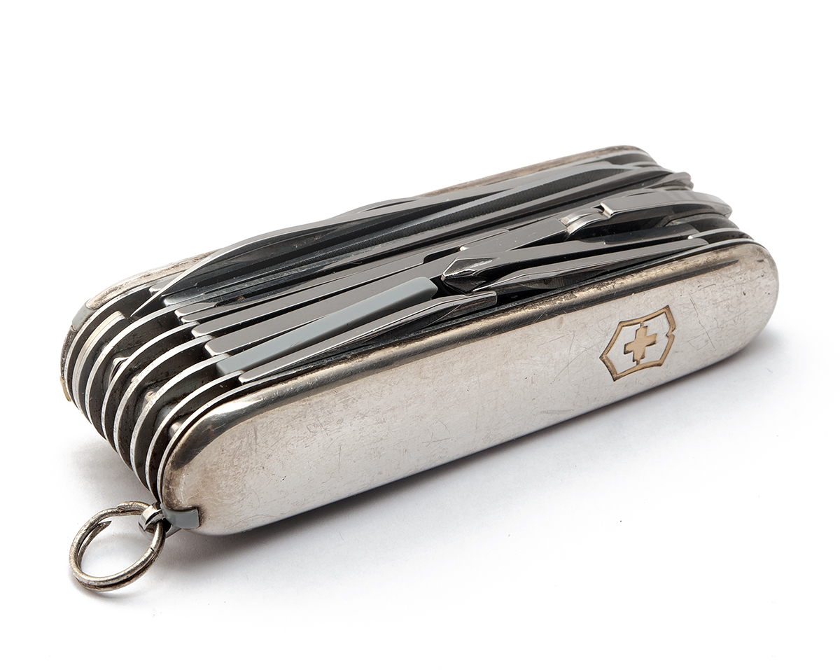 comprising of 20 separate blades or utensils, lanyard ring to one end, the polished smooth silver scales marked with a Victorinox cross trademark in gold to one side and signed 'TIFFANY & CO, 925 + 750 STER + 18K' to the rounded tip of the other, lightly used condition