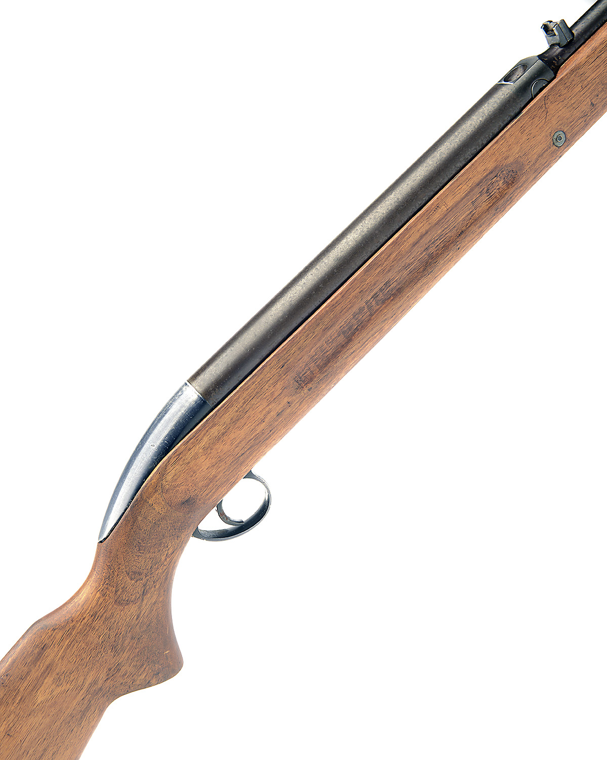 A .22 UNDER-LEVER AIR-RIFLE SIGNED BSA, MODEL 'AIRSPORTER MKI', serial no. G19379, with 18 1/2in. sighted barrel, plain air chamber without provision for telescopic sight (no etching visible) and three-piece walnut half-stock, finish worn