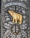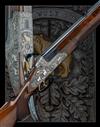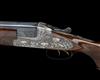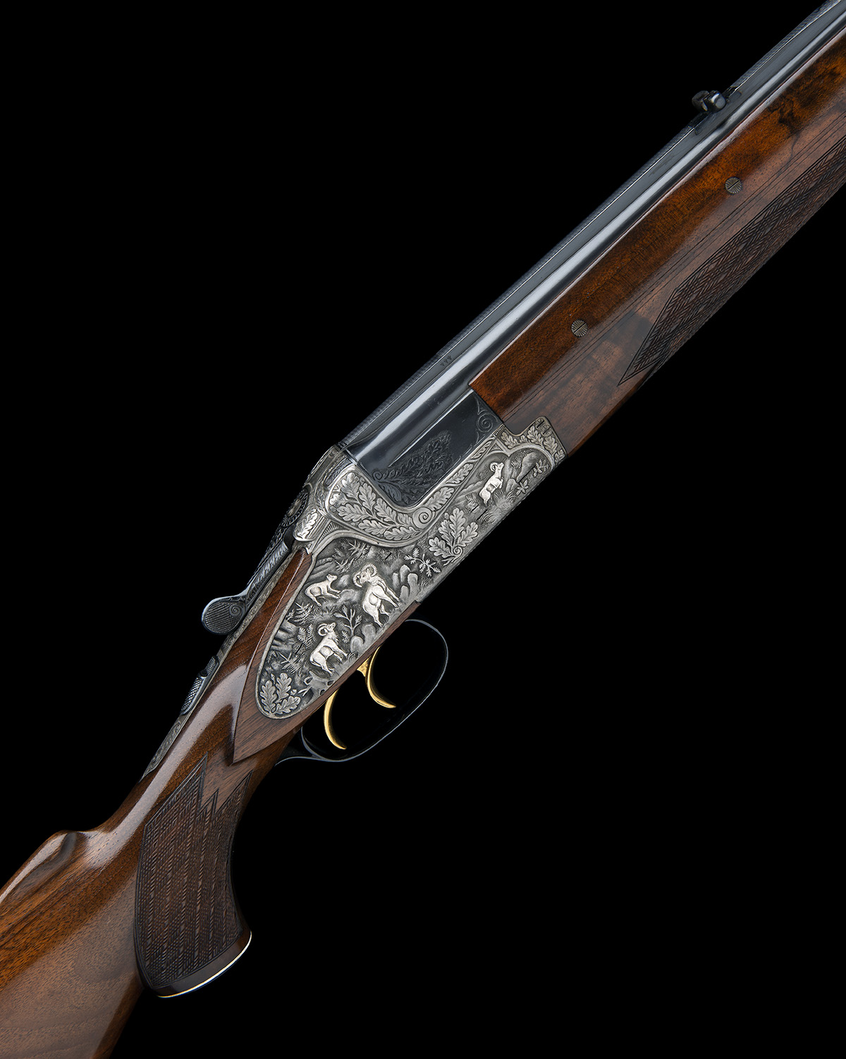 25 5/8in. nitro barrels (dated for 1973) with matt sight rib, folding open sights and ramp-mounted bead fore-sight, three-piece fore-end with wooden side fillets, bolstered action with hold-open toplever, manual safety, gold-washed triggers, the front a set trigger, carved with Germanic scrollwork, oak leaf and acorn motifs, the decorative sideplates carved in high relief with game scenes of wild boar and mouflon with silver highlighting, the underside carved in high relief and gold-inlaid with a bear, old silver finish, 14 3/8in. figured pistolgrip stock with cheekpiece, sling swivels, pistolgrip-cap and buttplate, weight 8lb. 5oz.