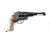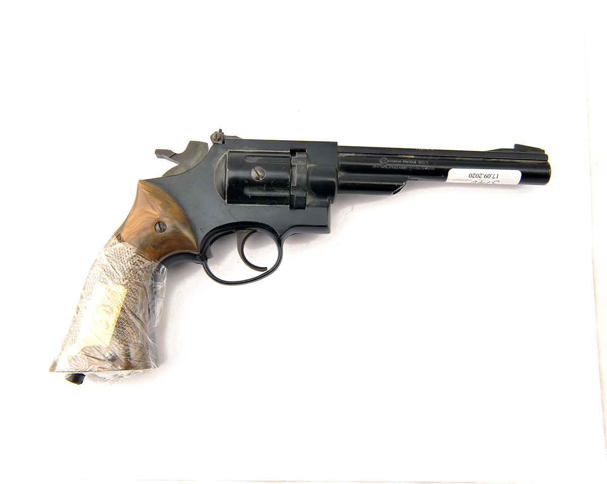 in imitation of a full-bore revolver, with blacked 6in. barrel, adjustable sights, rotating magazine and chequered plastic grips, untested, as found