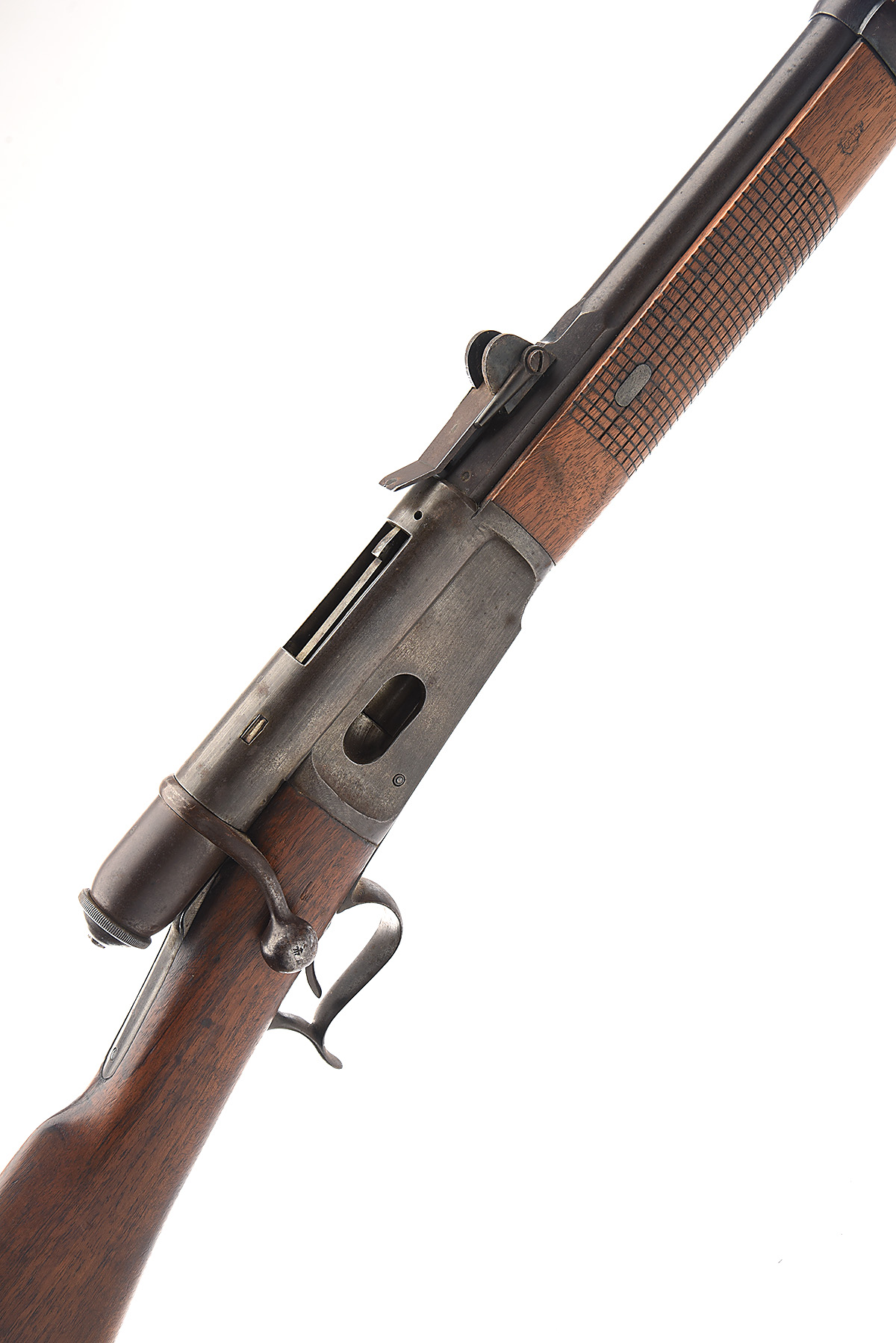 with 33in. barrel fitted with block and blade front-sight and quadrant rear-sight, the action stamped "SOC. IND, SUISSE / SYSTEM VETTERLIN", two piece iron mounted full walnut stock the forend with square cut chequering and three barrel bands, rod missing. The barrel and action with some original blue finish balance to a plum brown patina, action at fault.
