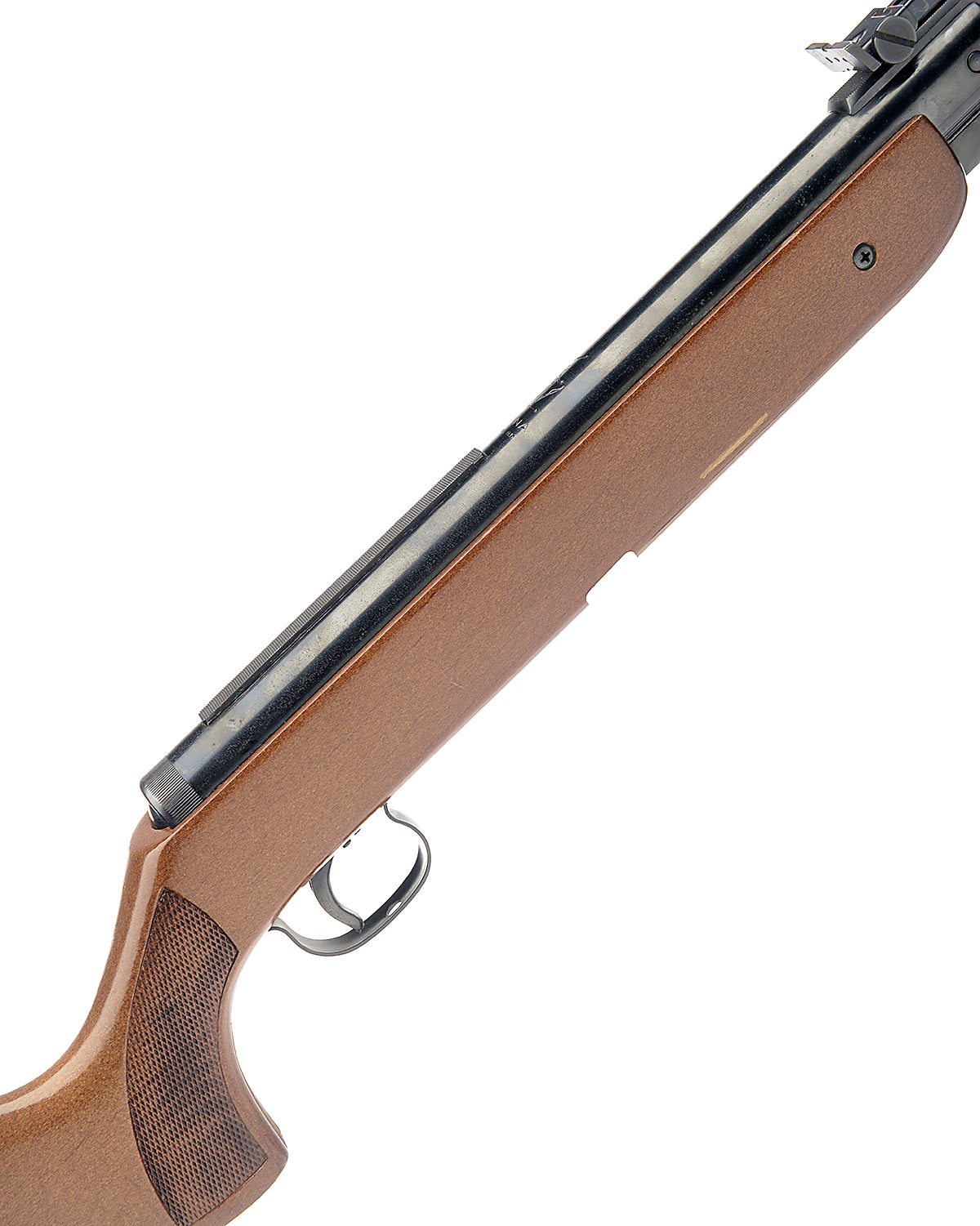 with blued and sighted 18 3/4in. barrel, blued air-chamber with applied telescopic sight rail and beech half-stock