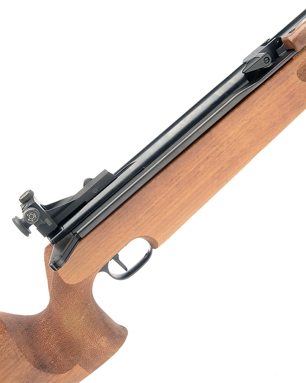 with blued 19 1/2in. barrel, built-on muzzle-weight, flip-open breech, plain air-chamber, target sights and anatomical right-hand walnut stock, recently serviced