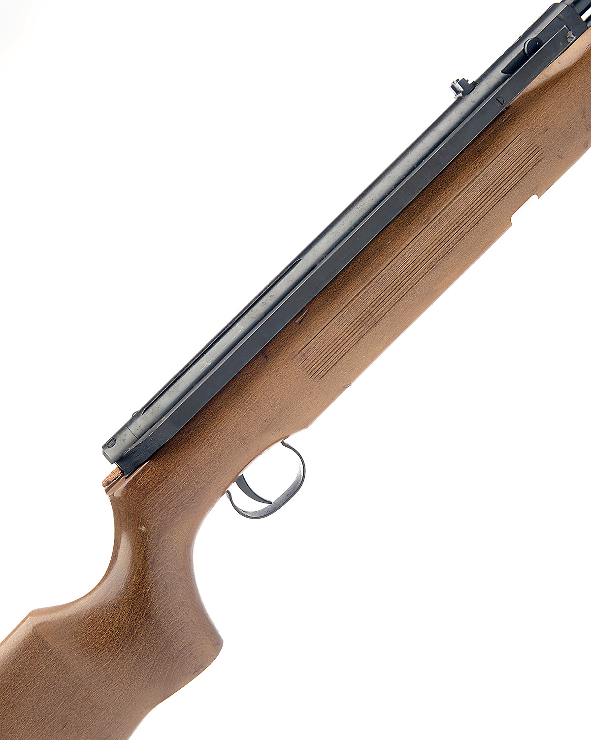 produced by Hammerli, with 18in. sighted blued barrel, full-length under-barrel weight, plain air-chamber with telescopic sight grooves and beech half-stock, missing loading tap handle