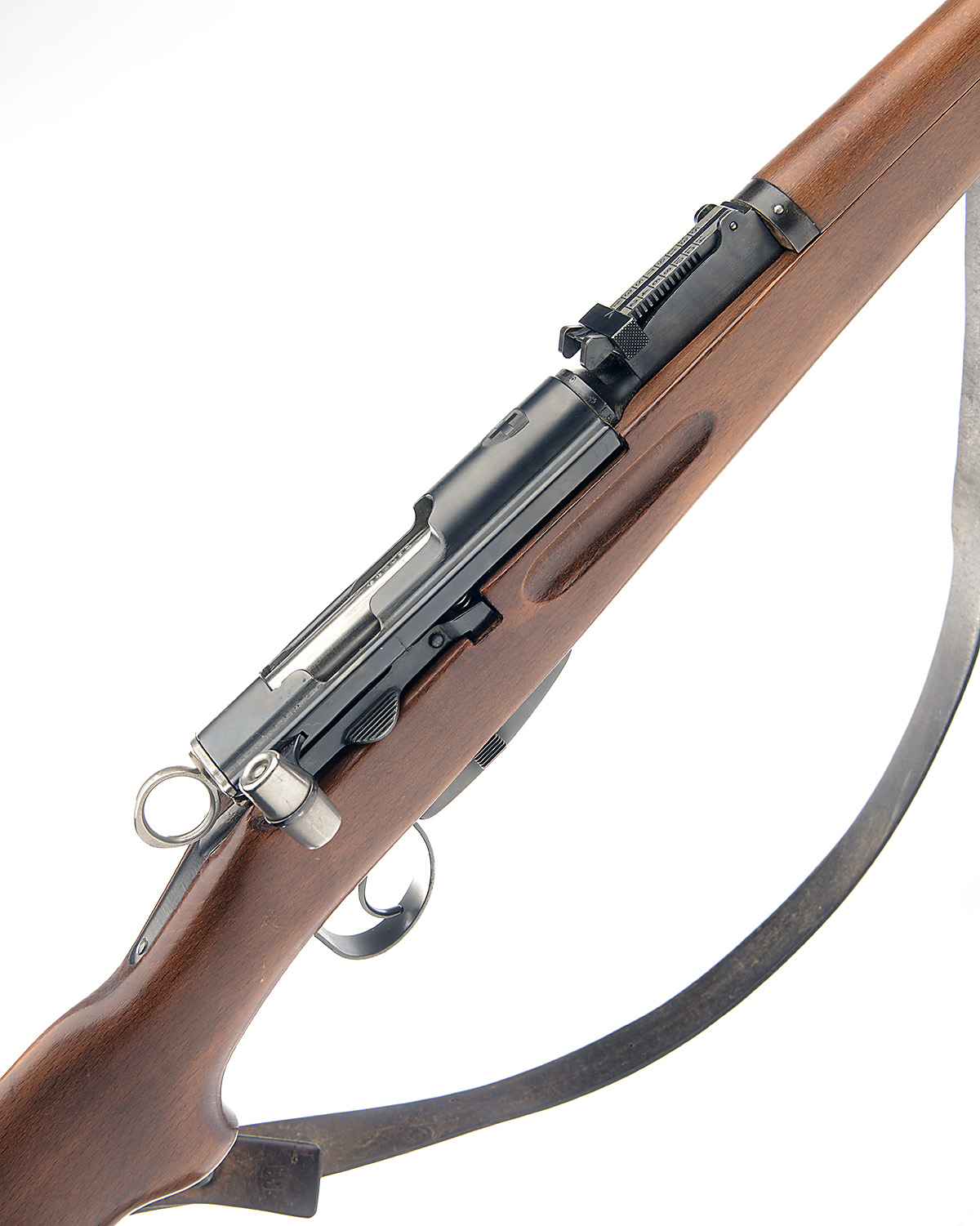 26in. barrel, block-mounted fore-sight, tangent rear-sight graduated to 1500 meters, detachable magazine, leather side sling