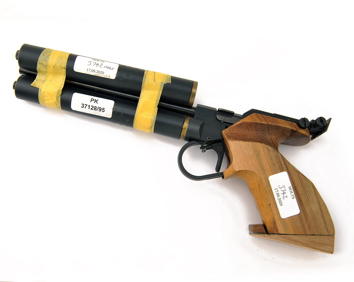 with match-sighted 8 3/4in. barrel, alloy receiver, walnut right hand grip and under-barrel reservoir (spare included), untested