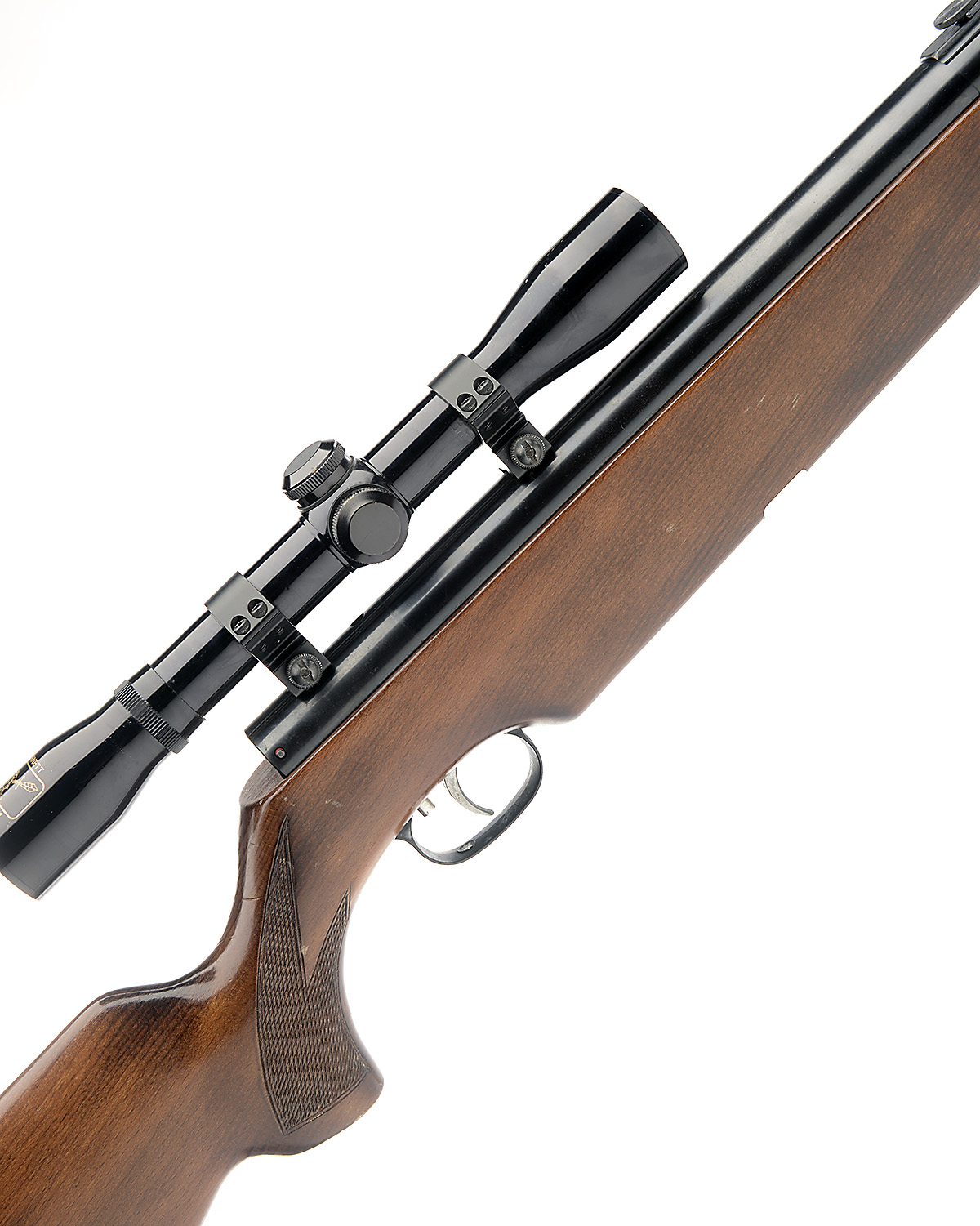 with 19 1/2in. barrel, air-chamber grooved for a telescopic sight and angular beech half-stock, much original finish remaining and fitted with a Barnett 4x32 telescopic sight