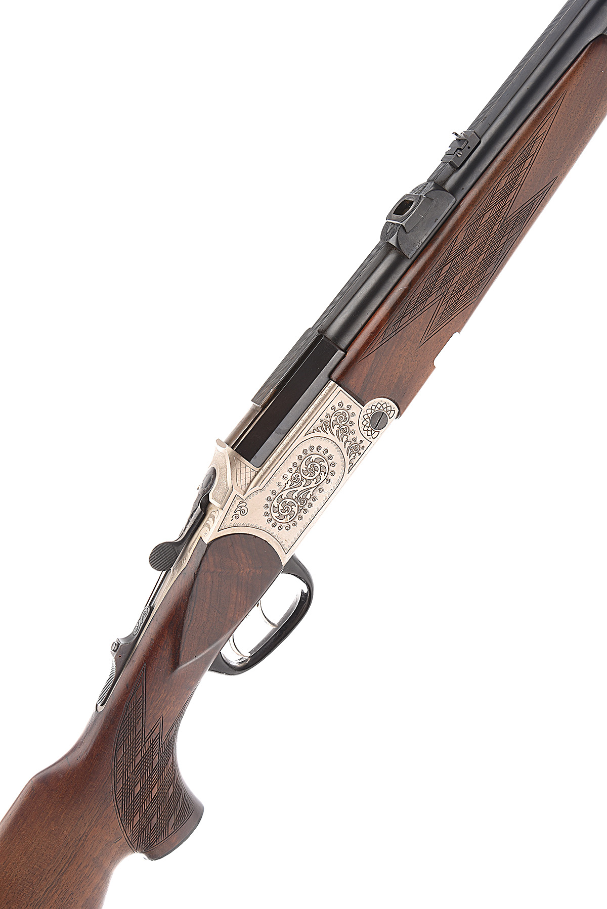 for 1974, 23 7/8in. nitro reproved barrels (in 2020), solid raised matt rib, open sights with folding leaf sight, blade fore-sight, the breech end with quickly-detachable telescopic sight front base (missing rear), 2 3/4in. shot chamber, bored approx. 3/4 choke, lightweight alloy action, sprung safety / cocking lever, set front trigger, synthetic triggerguard, 14 1/2in. pistolgrip stock with cheekpiece, hogsback comb, sling swivels and including 1in. recoil pad, weight 6lb. 4oz.
