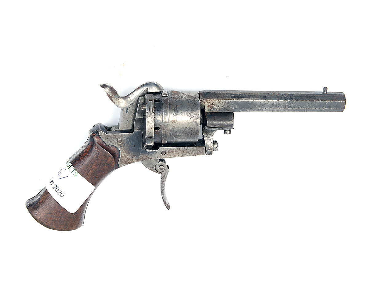 * A 9mm DOUBLE-ACTION PIN-FIRE REVOLVER, UNSIGNED, MODEL 'LEFAUCHEUX TYPE'. no visible serial number, circa 1870s, probably of Belgian manufacture, with 85mm octagonal barrel, plain cylinder with hinged loading gate, open frame with provision for ejector rod (missing), integral grip-straps, smooth wooden grips, hinged trigger, Liege proof marks, some pitting and rust