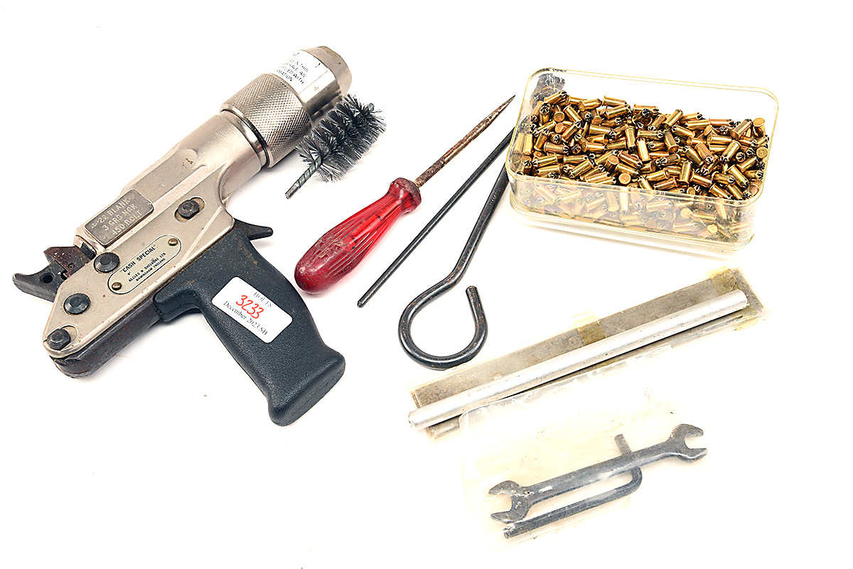 A .22 (BLANK) CAPTIVE-BOLT HUMANE KILLER, SIGNED ACCLES & SHELVOKE 'MODEL CASH SPECIAL', serial no. 9736, with brushed bright finish, external hammer and soft rubber grip, in a box with some blanks and other accessories