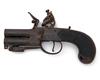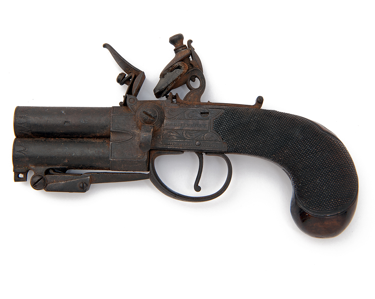 A 60-BORE FLINTLOCK OVER-UNDER TAP-ACTION BOXLOCK POCKET-PISTOL WITH SPRUNG BAYONET,
