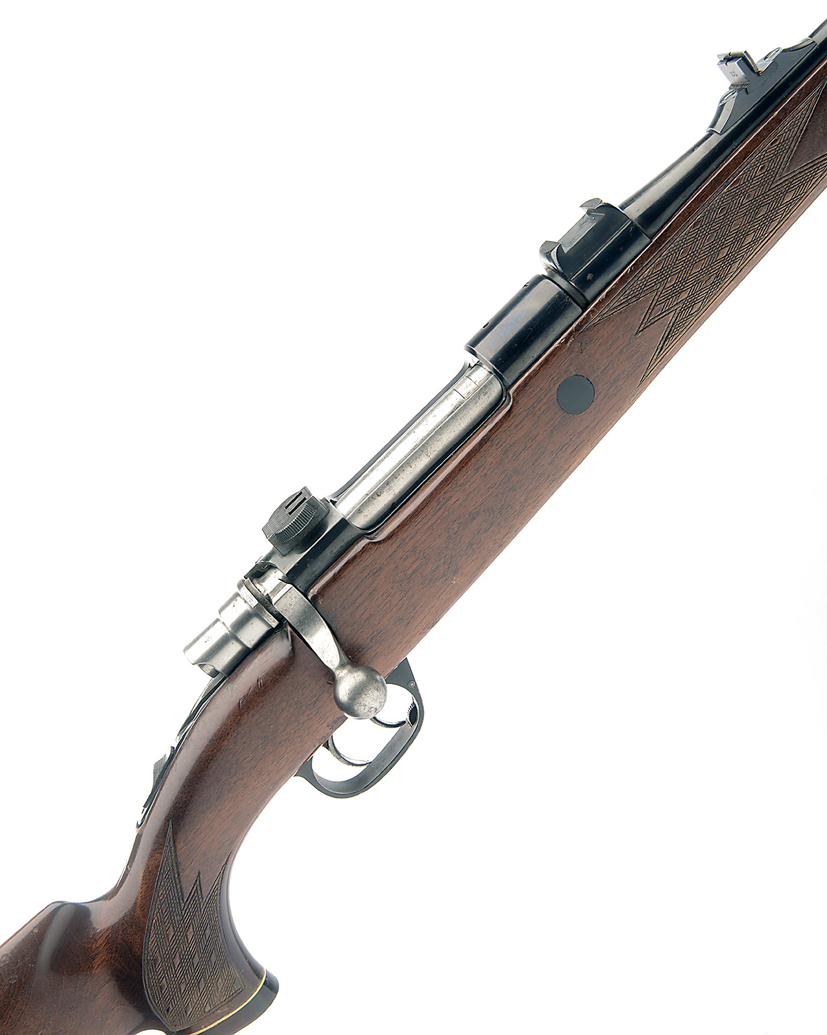 Circa 1960. 23 3/4in. nitro barrel, ramp-mounted fore-sight (bead missing), leaf rear-sight with 1 x folding sight, manual tang safety, hinged floorplate, set triggers, 14in. well-figured pistolgrip stock (including ventilated recoil pad) with cheekpiece, sling swivels